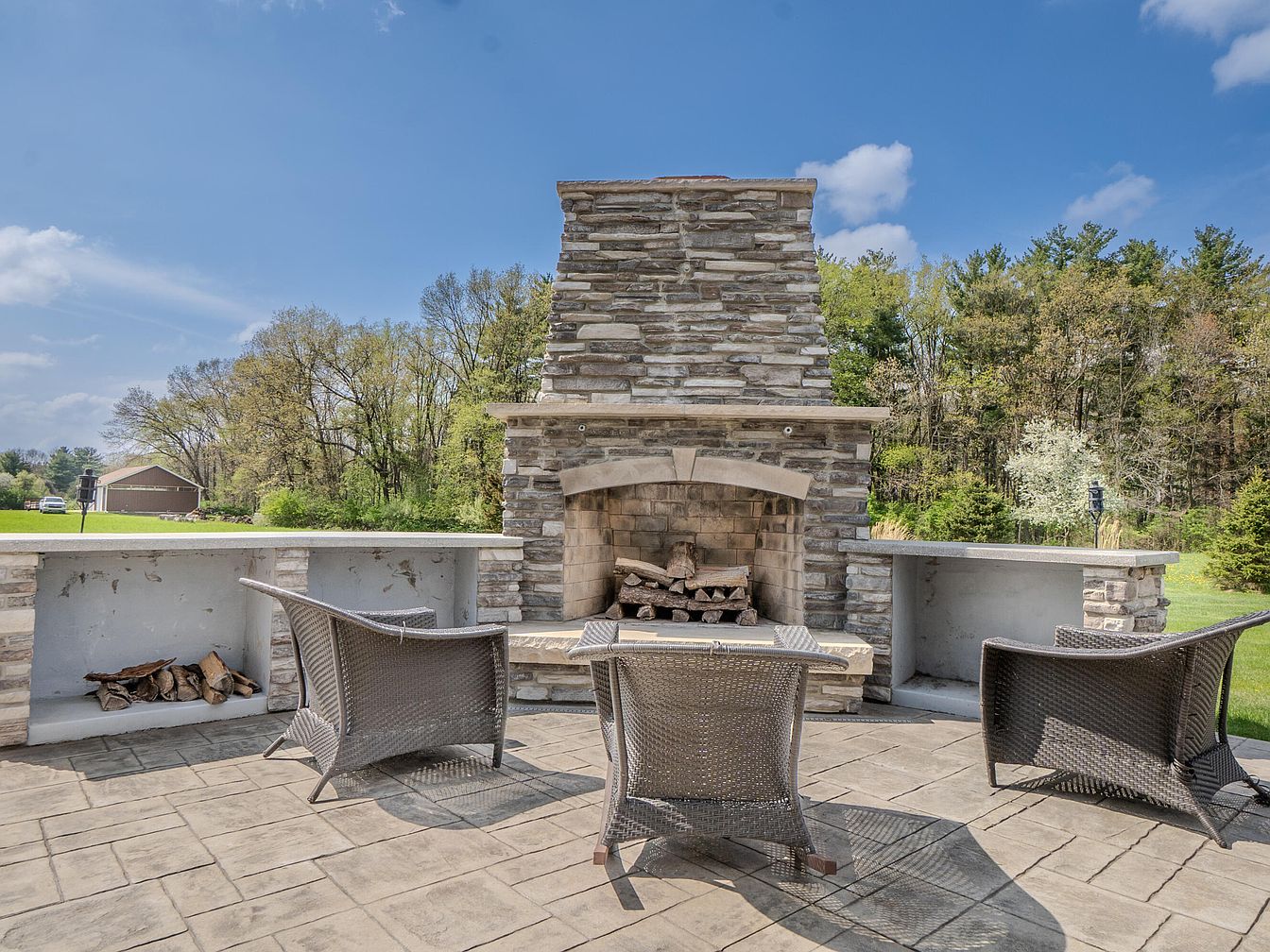 This inviting outdoor patio centers around a grand stone fireplace featuring a rustic, stacked stone façade with a wide hearth framed by a subtle keystone arch. The spacious patio is paved with large, textured stone tiles in neutral earth tones that complement the fireplace’s natural stonework. Three woven rattan chairs in a muted grayish-brown shade are arranged facing the fireplace, offering a cozy conversation area. Built-in stone shelving on either side of the fireplace provides storage, one side stocked with firewood. Lush greenery and tall trees surround the open outdoor space under a bright blue sky.