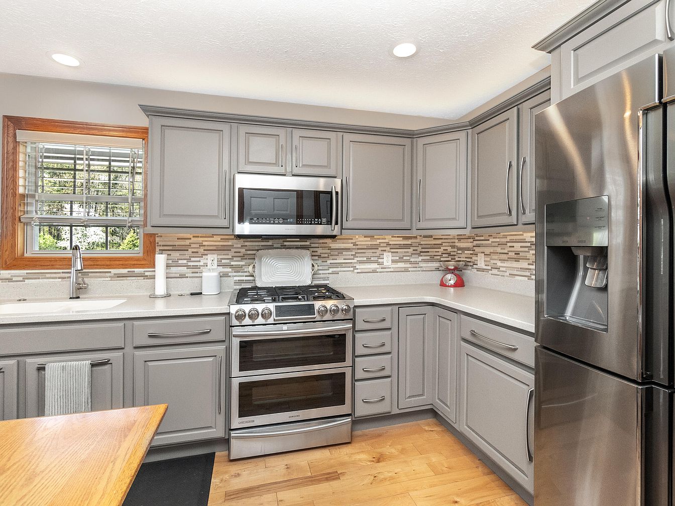 This kitchen features a U-shaped design maximizing counter and storage space. Soft gray cabinetry with simple yet classic paneling contrasts well with the warm hardwood flooring. Stainless steel appliances, including a double oven range with a gas cooktop, microwave, and a large refrigerator with a water and ice dispenser, blend seamlessly into the space. A mosaic tile backsplash in neutral tones adds visual interest and texture, connecting the cabinetry and countertops. A window with wooden trim and white blinds provides natural light above the single-basin sink. The overall color palette is modern and calming, with functional lighting from recessed ceiling fixtures.