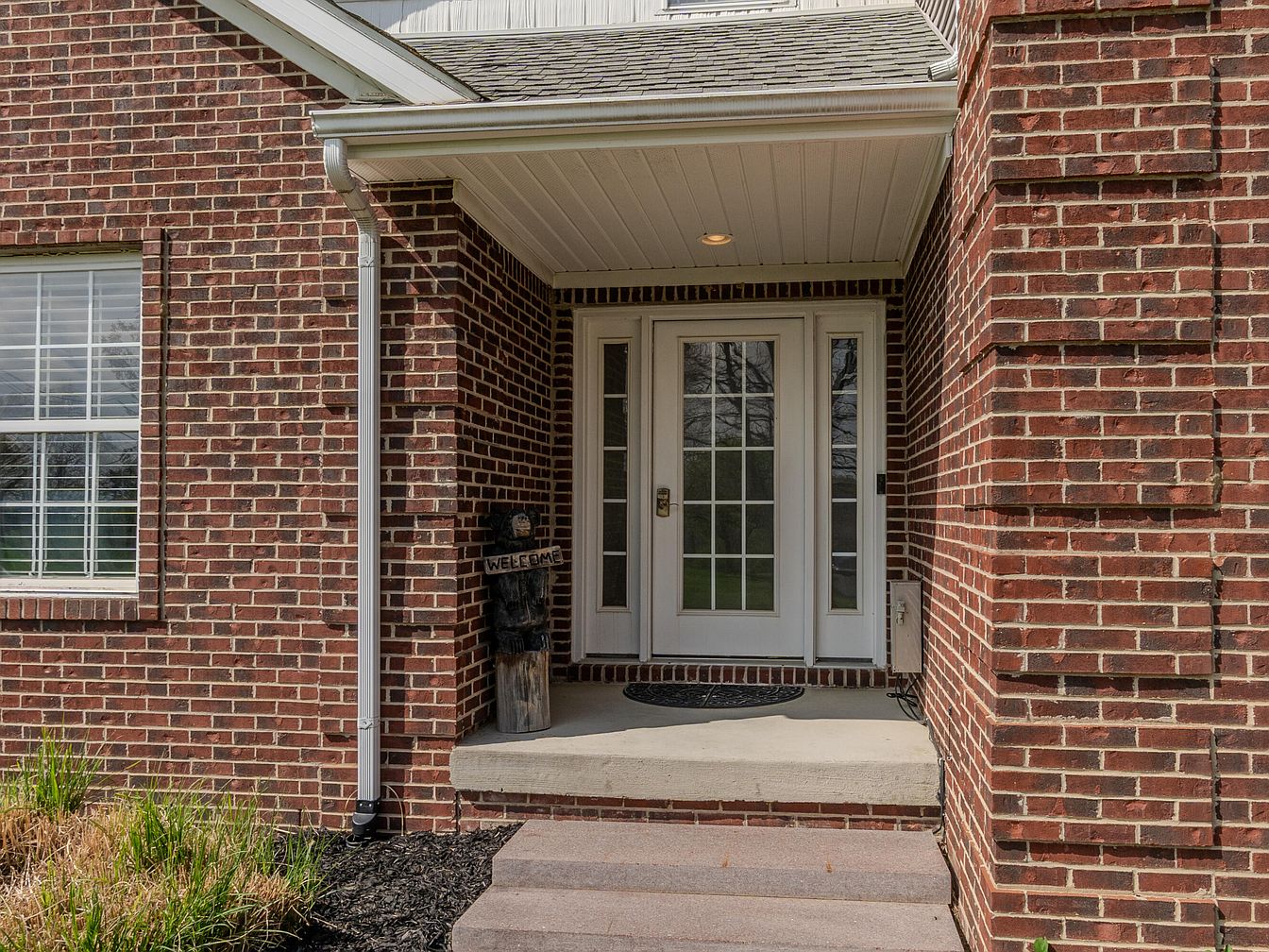 The front porch showcases a welcoming entryway with classic red brick walls forming the façade. White-framed glass double doors, flanked by narrow sidelights, bring in natural light while maintaining privacy. A recessed ceiling with a single recessed light adds subtle illumination to the sheltered space. The concrete porch is elevated by a step, leading up to a small black welcome mat. A rustic carved wooden bear holding a ‘Welcome’ sign adds charm and personality. The contrast between the warm brick and white elements creates an inviting and timeless aesthetic for the home’s entrance.