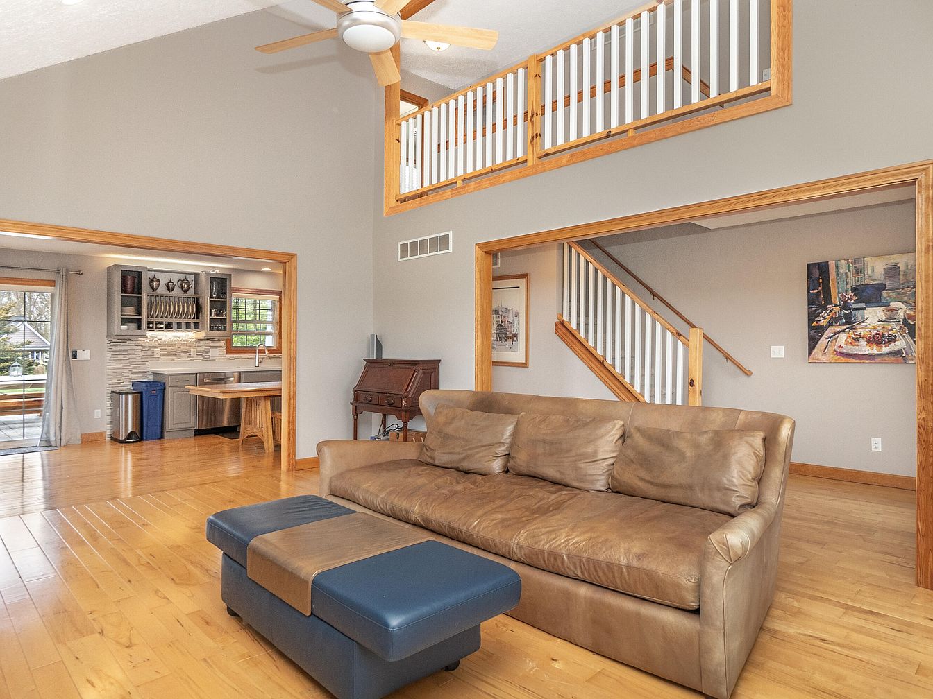This airy living room features a vaulted ceiling with a ceiling fan, enhancing the sense of spaciousness. The room’s focal point is a soft, worn leather sofa paired with a two-tone ottoman, combining functionality with casual comfort. Natural wood flooring extends throughout, matching the light wood trim around doorways and stair railings, creating warm continuity. Through large open entries, the kitchen is visible, offering sleek gray cabinetry and a decorative tile backsplash that adds texture. A staircase with white balusters and wood handrails leads upstairs, framing the space with architectural interest. Neutral taupe walls unify the space, inviting natural light that brightens this welcoming area.