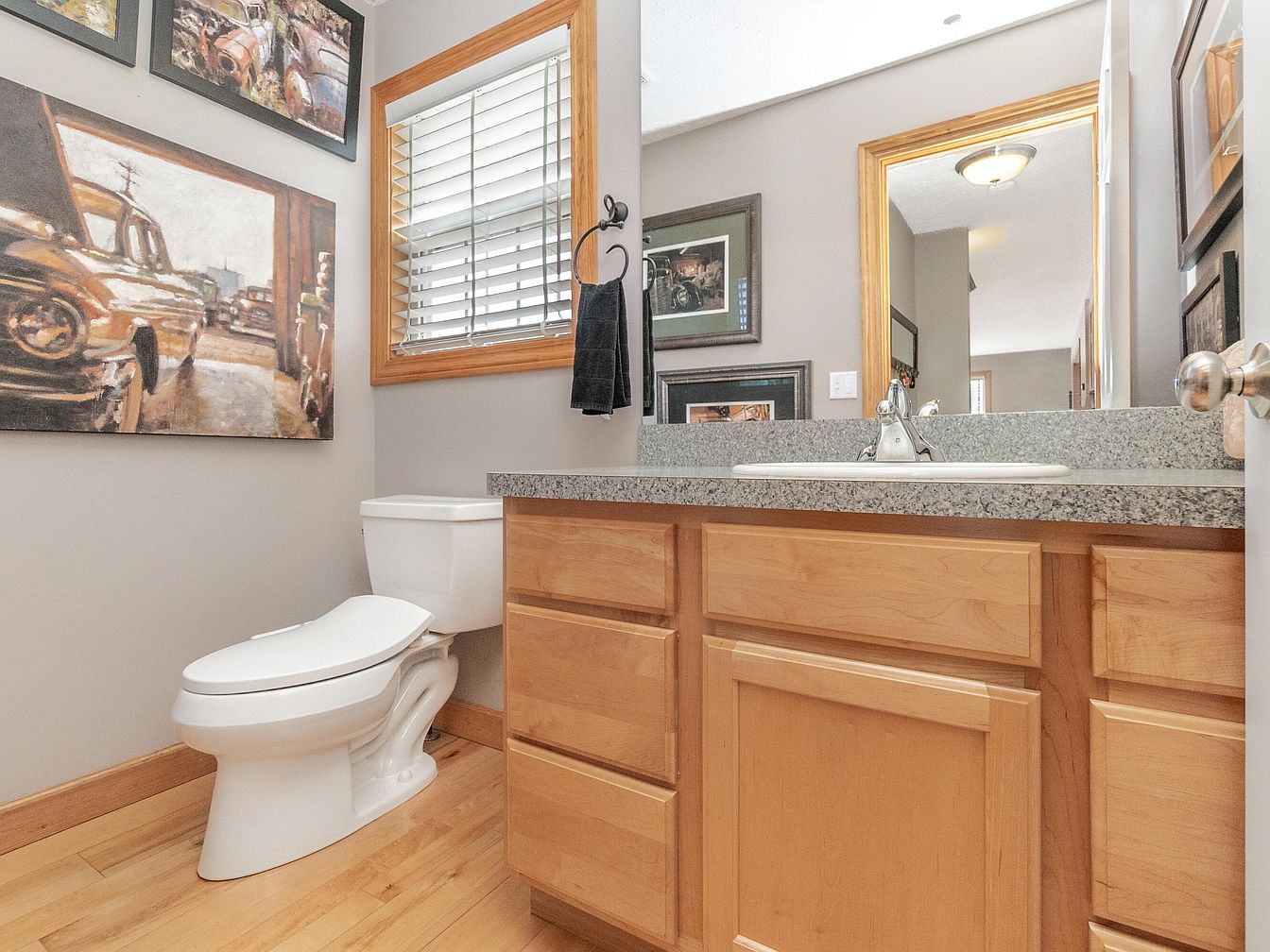 This bathroom features a practical layout with a white toilet positioned next to a light wood vanity. The vanity is topped with a speckled granite countertop that supports a white sink and a simple chrome faucet. The walls are painted a soft, neutral gray, harmonizing with the natural wood tones of the vanity and flooring. A large mirror with a matching light wood frame occupies much of the wall above the sink, enhancing the room’s brightness. Window blinds in natural wood trim offer privacy and add warmth, complemented by black towel rings and framed artwork depicting vintage cars, lending a nostalgic touch to the space.