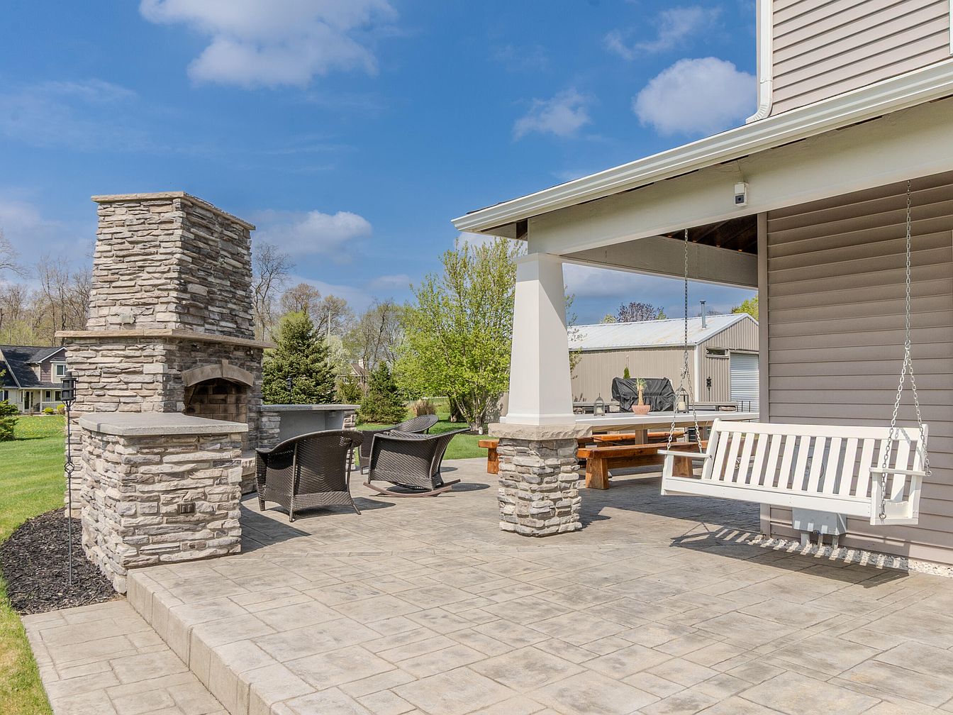 This spacious outdoor patio blends functionality with a welcoming design. The flooring is paved with light-toned stamped concrete, complementing the soft beige siding of the home. A stone fireplace stands as the patio’s centerpiece, crafted from stacked gray stones that add texture and rustic charm. Near the fireplace, two modern black wicker chairs provide a comfortable sitting area. The covered portion features strong white columns anchored by stone bases, supporting a roof that shelters a white wooden swing on chains, inviting relaxation. A wooden picnic-style bench and table set completes the setup, ideal for gatherings. Lush greenery and a clear blue sky frame the serene setting.