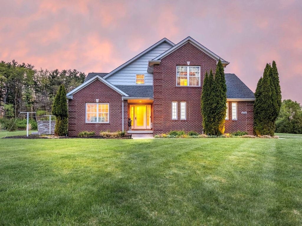 This stunning home features a blend of traditional brick and vinyl architectural styles, creating a timeless and elegant exterior look that complements its natural surroundings. Located in Whitmore Lake, Michigan, this residence was built in 2002 and boasts 1,898 square feet of well-designed living space above grade. Situated on 2.1 rolling acres, the property offers panoramic views in every direction, enhancing the sense of privacy and tranquility. Recent renovations include brand-new carpeting upstairs, adding warmth and comfort to the living areas. The home is a smart home with advanced technology such as Alexa-controlled lighting and Brilliant smart controls in the bedrooms, providing modern convenience and energy efficiency. The interior features gleaming hardwood floors and a dramatic living room with soaring ceilings and a striking stone-accented gas fireplace, creating a welcoming and cozy atmosphere. The chef’s kitchen is a highlight, equipped with high-end stainless steel appliances including a double oven, ample cabinet space, a ceramic tile backsplash, solid surface countertops, and elegant custom built-ins. The spacious primary suite includes a walk-in closet and a luxurious bathroom with a jetted tub and a separate stand-alone shower. Additional amenities on the main floor include a laundry room with a sink and built-in storage for added convenience. The outdoor entertaining space is remarkable with stamped concrete flooring, an outdoor fireplace, a custom-built barbecue with a natural gas hookup, two refrigerators, and sleek concrete countertops, making it perfect for hosting gatherings.