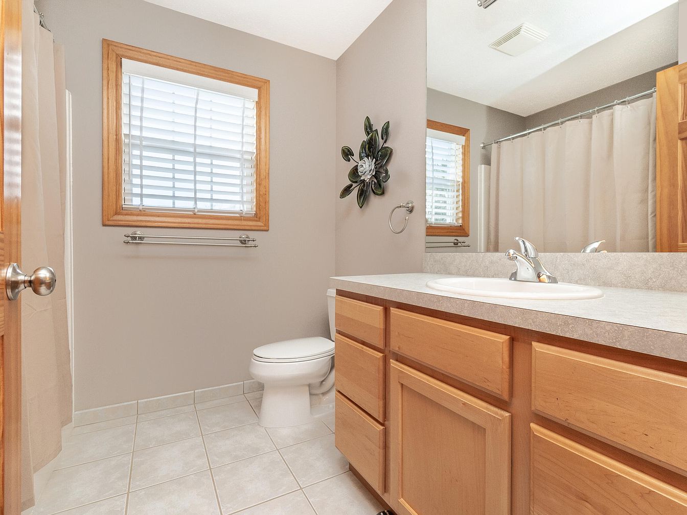 This bathroom features a compact yet functional layout with light beige tile flooring and soft grey walls accented by natural wood window trim and cabinetry, creating a warm, inviting atmosphere. The vanity boasts a light wooden cabinet with several drawers and a smooth countertop supporting a simple white sink with a chrome faucet. A large mirror runs the length of the vanity, visually enlarging the space. The toilet sits adjacent to the countertop under a window fitted with white blinds. A towel rack and a wall-mounted metal decor piece add subtle finishing touches.