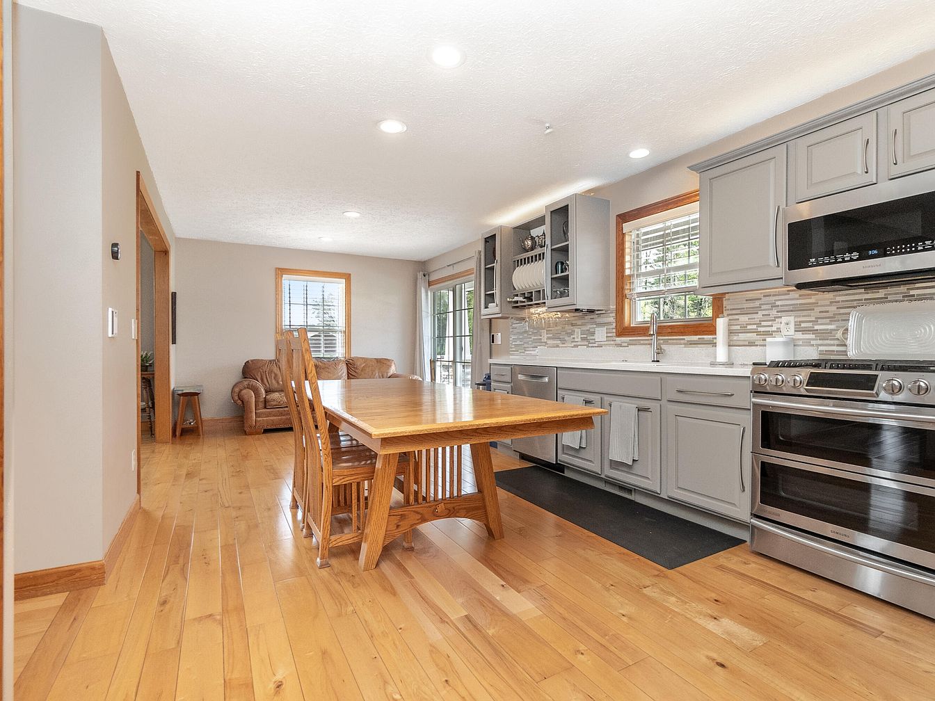 This open-concept kitchen and dining area features warm wooden floors complementing a sturdy, rectangular dining table with matching wooden chairs. The kitchen cabinetry is painted in a soft gray tone, contrasted by sleek stainless steel appliances including a double oven and microwave. A modern backsplash with mosaic tiles adds visual texture above the white countertop, which houses a single-handle faucet and sink beneath a window framed in natural wood. Recessed ceiling lights provide ample illumination, while a sitting area with a leather sofa is situated near a window and a glass door leading outside, creating a cozy gathering space that seamlessly blends function and comfort.