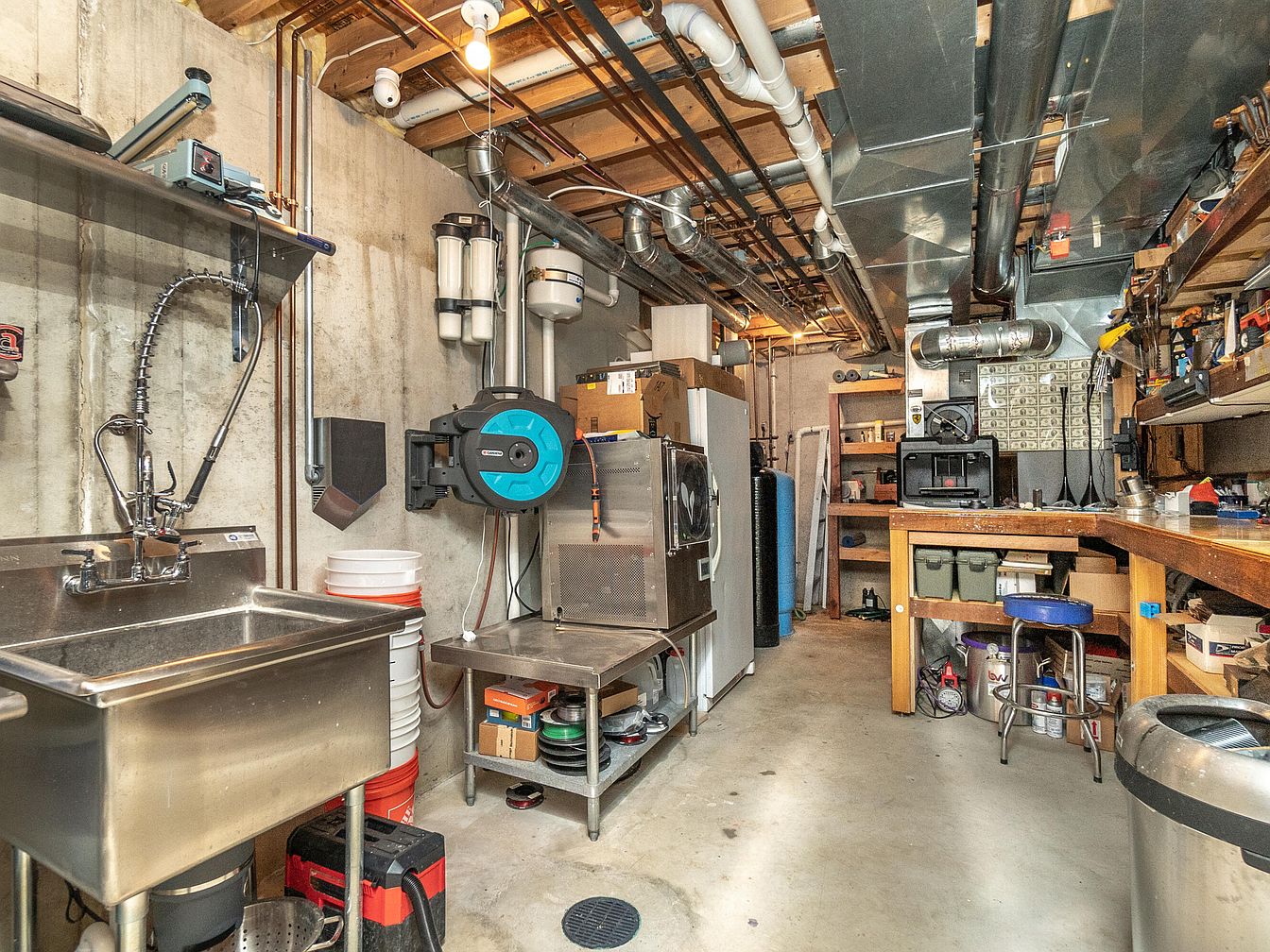 This basement space functions as a practical workshop and utility area, anchored by a stainless steel utility sink with a high-arc, flexible pull-down faucet on the left. The concrete floor and unfinished concrete walls provide a rugged backdrop, enhanced by exposed ceiling beams and visible ductwork and piping overhead. On the right, a wooden workbench is lined with storage bins, tools, and supplies, reflecting an organized workshop environment. Steel shelving and a heavy-duty metal table hold various equipment, while bright lighting ensures clear visibility. The overall aesthetic is industrial and utilitarian, optimized for functionality and maintenance tasks.