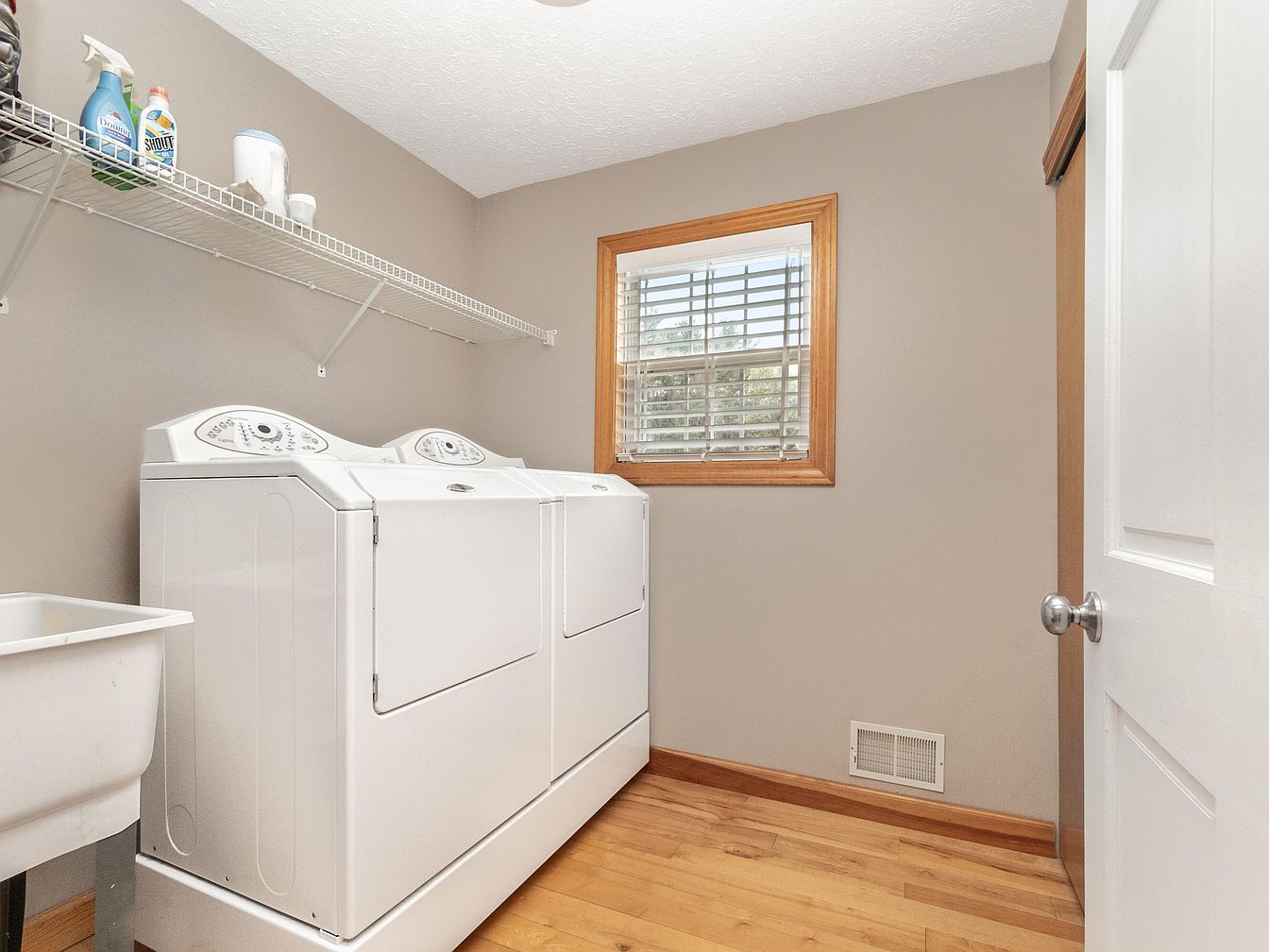 This functional laundry room features a clean, minimalist layout with a practical white washer and dryer set positioned side by side. The walls are painted in a soft taupe shade, harmonizing well with the natural wood trim around the single window and baseboards, which adds a warm contrast. Light wood flooring enhances the room’s cozy yet practical atmosphere. Above the appliances, a white wire shelf provides convenient storage for cleaning supplies, maintaining an airy and organized space. The window has white blinds, allowing natural light to brighten the room while preserving privacy. A simple white utility sink stands adjacent for added convenience.