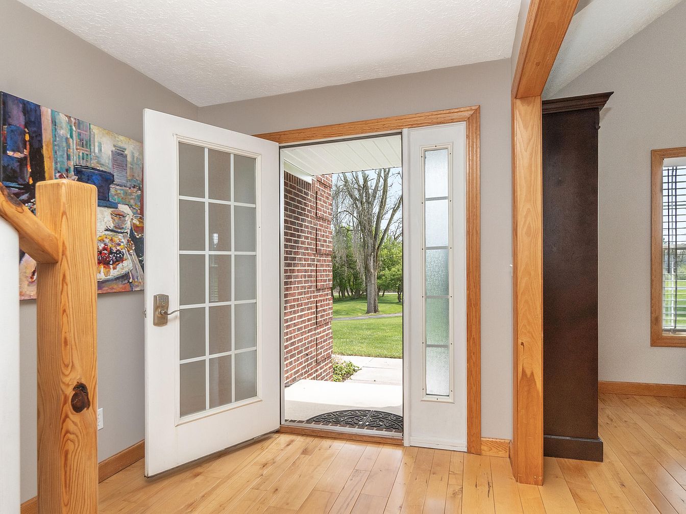 This welcoming front entrance foyer features a light wooden floor that extends throughout the space, creating warmth and continuity. The white door with a grid of frosted glass panels opens to reveal a brick exterior and a verdant lawn beyond, inviting natural light inside. A narrow vertical window with textured glass beside the door adds an architectural touch while maintaining privacy. Natural wood trim and a sturdy rustic handrail at the stairway contribute subtle character, enhancing the airy, neutral-toned walls. A colorful painting adds a pop of visual interest, emphasizing the foyer’s inviting, well-balanced aesthetic.