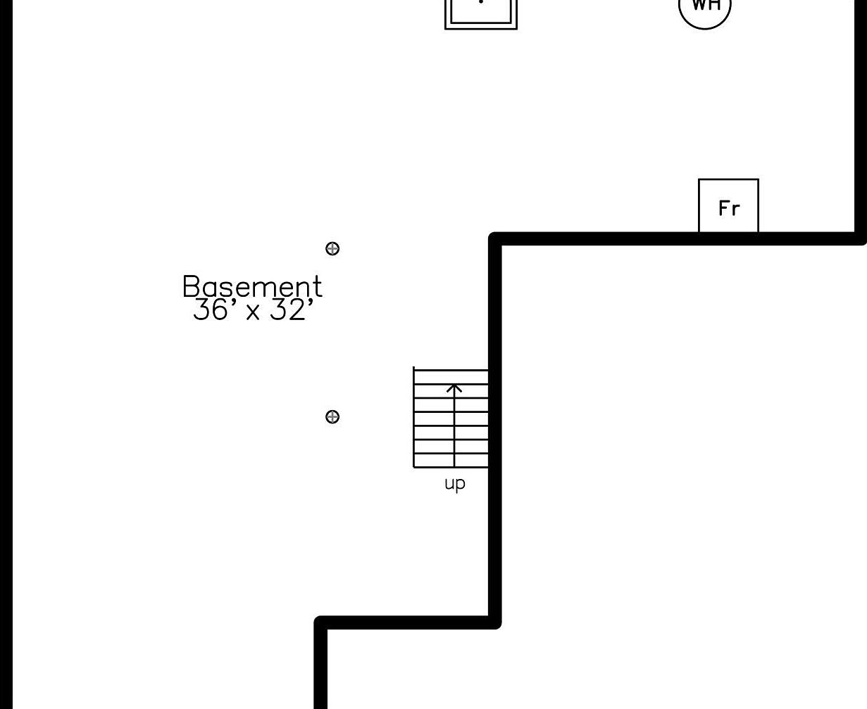 This basement layout measures 36 by 32 feet, indicating a spacious open area adaptable for various uses such as storage, recreation, or additional living space. A staircase is centrally positioned on one side, directing upward, which likely connects to the main floor. The plan includes utility features labeled as WH (water heater) and Fr (likely a furnace), suggesting the mechanical equipment is housed here. Thick boundary walls are evident, characteristic of basement construction. The straightforward design allows flexibility in arranging furnishings or subdividing zones according to functional needs.