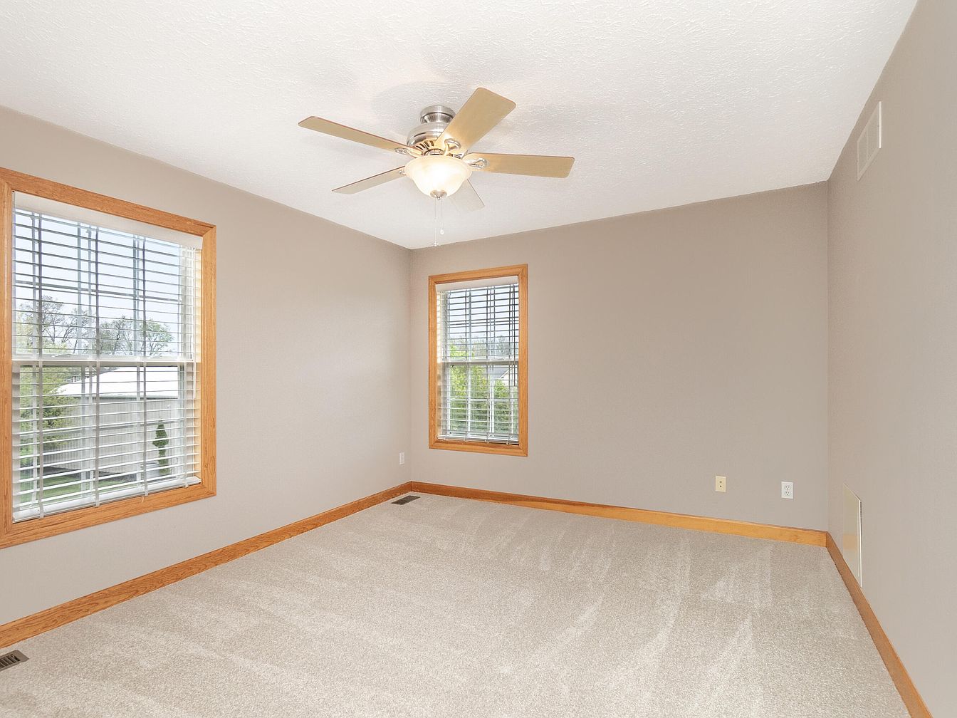 This cozy bedroom features a neutral palette with soft beige walls contrasting the warm wooden window trim and baseboards. Two large windows with white blinds invite ample natural light, brightening the plush light gray carpet. A modern ceiling fan with a light fixture offers both comfort and function. The room’s layout is simple, emphasizing open space and versatility. Electrical outlets and vents are subtly positioned for convenience. The combination of neutral tones and natural wood accents makes this room an inviting blank canvas for personalized decor and restful ambiance.