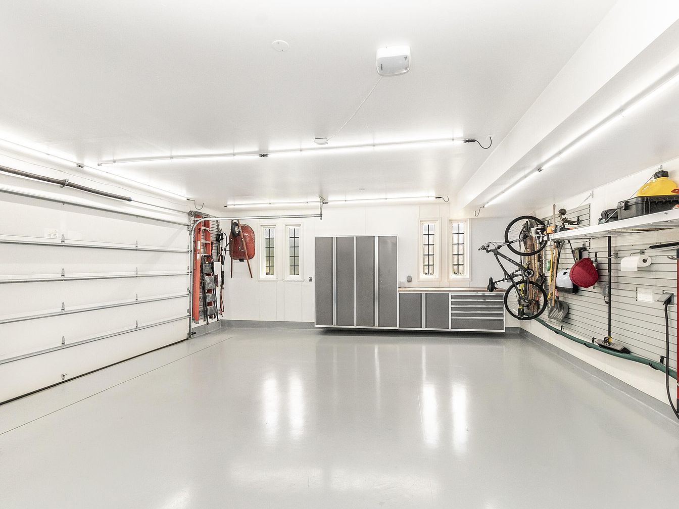 This garage features a bright, clean, and spacious design with a polished light gray floor and white walls that enhance the sense of openness. The large white sectional garage door occupies one side, while three narrow vertical windows bring in natural light, framed in white for a cohesive look. Modern gray storage cabinets with metallic finishes line one wall, providing ample space for tools and equipment. A workbench is integrated beneath the windows. On the opposing wall, slatwall panels hold items like a bicycle, gardening tools, and various supplies, demonstrating efficient use of vertical space. Ceiling-mounted fluorescent lights offer bright, uniform illumination, highlighting the garage’s organized and minimalist aesthetic.