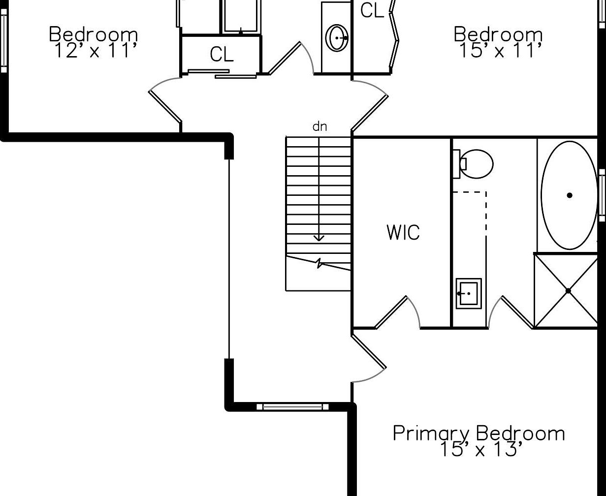 This upper floor plan features a thoughtful layout with three bedrooms, including a spacious primary bedroom measuring 15 by 13 feet. Adjacent to the primary suite is a walk-in closet (WIC) and a private bathroom equipped with a bathtub, shower, toilet, and double vanity. Two additional bedrooms, sized 12 by 11 feet and 15 by 11 feet respectively, flank the hallway, which centers on a staircase descending to the lower level. Closets (CL) are strategically placed for storage, and a small bathroom with a sink and toilet serves the secondary bedrooms, creating a balanced and practical family living space.