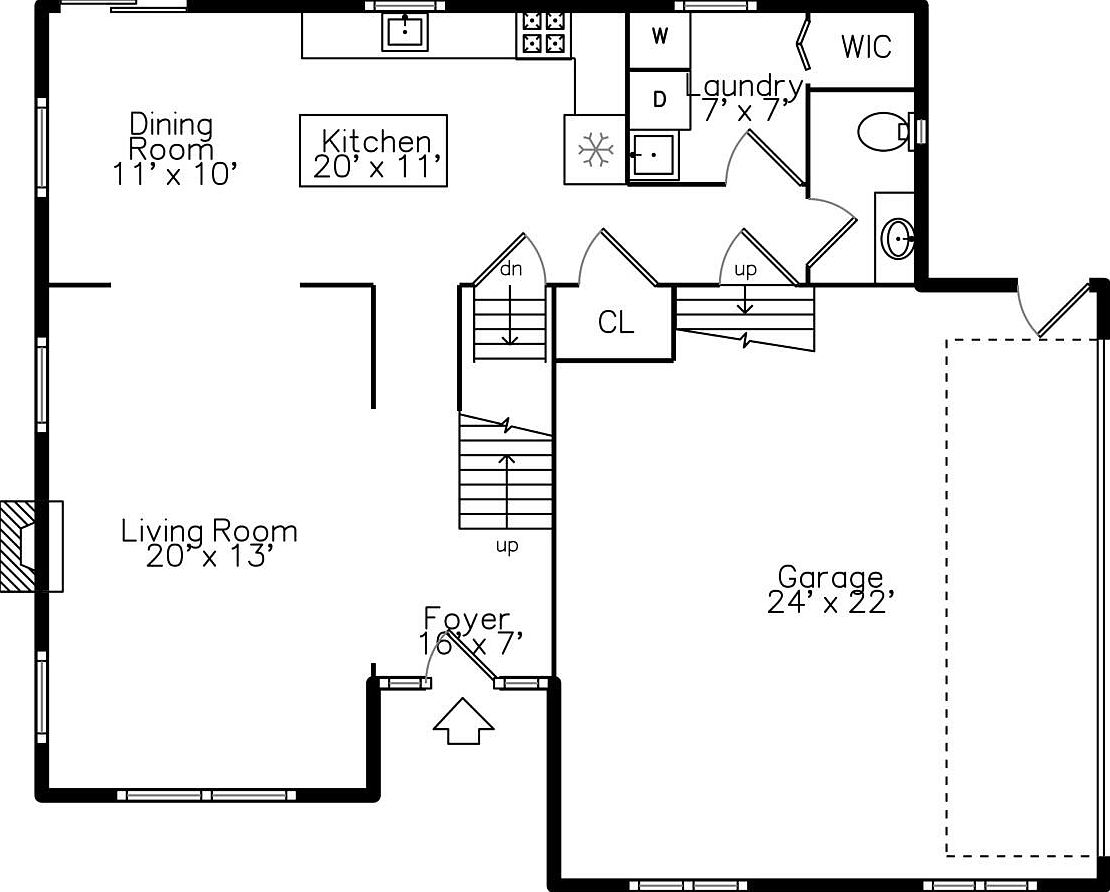 This floor plan showcases the main level featuring a spacious living room measuring 20 by 13 feet, positioned adjacent to an 11 by 10 feet dining area. The centerpiece kitchen spans 20 by 11 feet, equipped for ample cooking and gathering space. A central foyer, 16 by 7 feet, welcomes entry and leads to stairs that connect upper and lower levels. The right side integrates a large 24 by 22 feet garage with direct access to a laundry room and a walk-in closet coupled with a small bathroom, optimizing functionality and flow throughout the home.