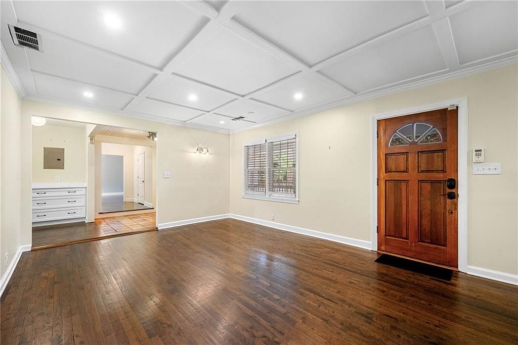 The space offers a warm welcome with a solid wooden front door featuring decorative arched window panes. The room’s layout opens into an adjoining area through a slight step and tiled section, hinting at a transition to a hallway or kitchen space. Walls are painted a soft cream, complementing the wide-plank dark hardwood flooring that adds richness and warmth. The ceiling showcases a sophisticated coffered design with recessed lighting, while white window shutters allow natural light to softly enter the room. Simple yet elegant, the entryway balances traditional and modern elements, creating a timeless, inviting atmosphere.