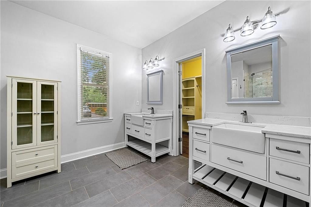 This bathroom features a spacious layout with clean, modern design elements. Two matching white vanities with shaker-style cabinets and open shelving below provide ample storage and surface space. Each vanity is topped with a white quartz countertop and has its own large rectangular mirror framed in a light gray tone. Above both mirrors are polished chrome three-light fixtures, enhancing the brightness and clarity in the room. The walls are painted a soft light gray, creating a calm and neutral backdrop, while the charcoal gray tiled floor adds contrast without overpowering the space. A small glass-front cabinet stands against the left wall, perfect for additional storage. A doorway reveals a glimpse of a brightly lit walk-in closet with built-in shelving, adding functionality and flow to this well-organized bathroom area.