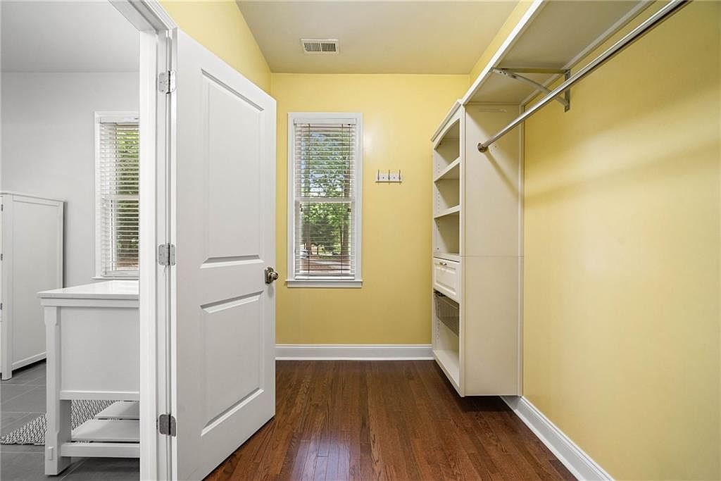 This walk-in closet features a warm yellow paint that brightens the space, complemented by rich hardwood flooring. On the right, built-in white shelving and drawers provide organized storage options along with an extended metal rod for hanging clothes. The closet’s layout maximizes vertical space with open shelves and hooks for easy access. A small window at the back allows natural light to enter, creating an inviting atmosphere. The white-bordered door opens into a connected room with neutral gray flooring and white cabinetry, adding to the overall clean and functional design.