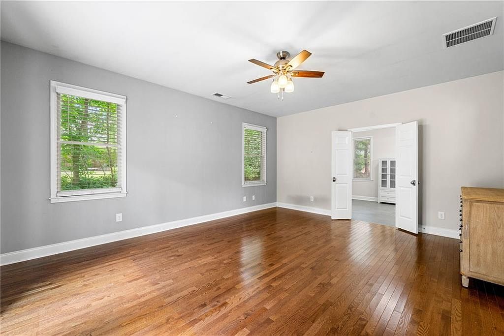 This well-lit bedroom features a calming neutral palette with soft gray and off-white walls creating a tranquil ambiance. The warm hardwood flooring adds richness and contrasts beautifully with the lighter walls. Natural light streams in through two large double-hung windows with white trim, offering views of greenery outside. A ceiling fan with light fixtures hangs centrally, providing both illumination and airflow. Double white doors open to an adjoining room, enhancing the spacious feel. The simple yet elegant design and minimal furnishings emphasize openness and versatility, perfect for a restful personal retreat.