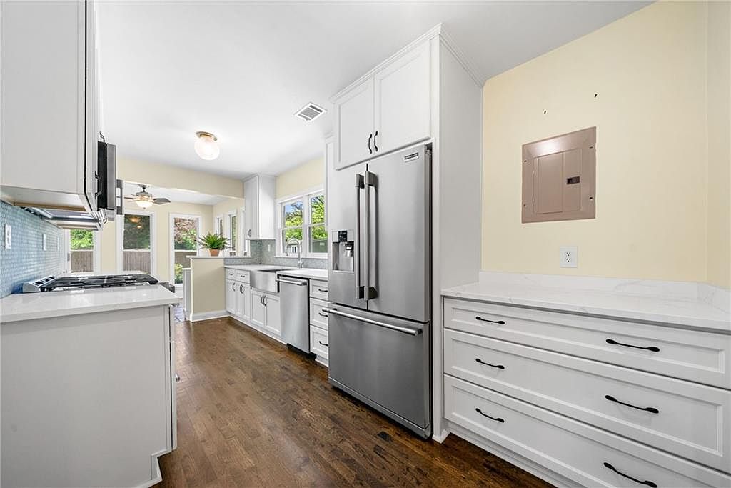 This kitchen presents a bright and airy galley layout with a modern yet inviting aesthetic. White cabinetry with black hardware contrasts beautifully against the warm, dark hardwood flooring. The sleek stainless steel refrigerator, dishwasher, and gas range complement the contemporary feel. The backsplash is a subtle blue mosaic tile, adding texture and a pop of color behind the stove. Light yellow walls enhance the room’s natural light, coming from large windows above the farmhouse-style sink. Marble countertops extend to both sides, offering ample workspace, while an open doorway leads to what appears to be a breakfast nook or dining area.