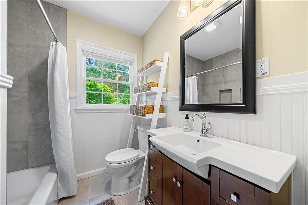 This bright bathroom combines a clean, modern aesthetic with traditional touches. Light beige walls contrast softly with white beadboard wainscoting. A large window brings in natural light, highlighting the greenery outside and enhancing the airy feel. The space includes a white porcelain toilet and a sleek white bathtub with gray tiled walls and a simple white shower curtain. A dark wood vanity provides warm contrast, topped with a white rectangular sink and polished silver faucet. Above it, a large, black-framed mirror creates a focal point, paired with soft, warm lighting fixtures. A white open shelving unit above the toilet adds practical storage with woven baskets, balancing form and function.