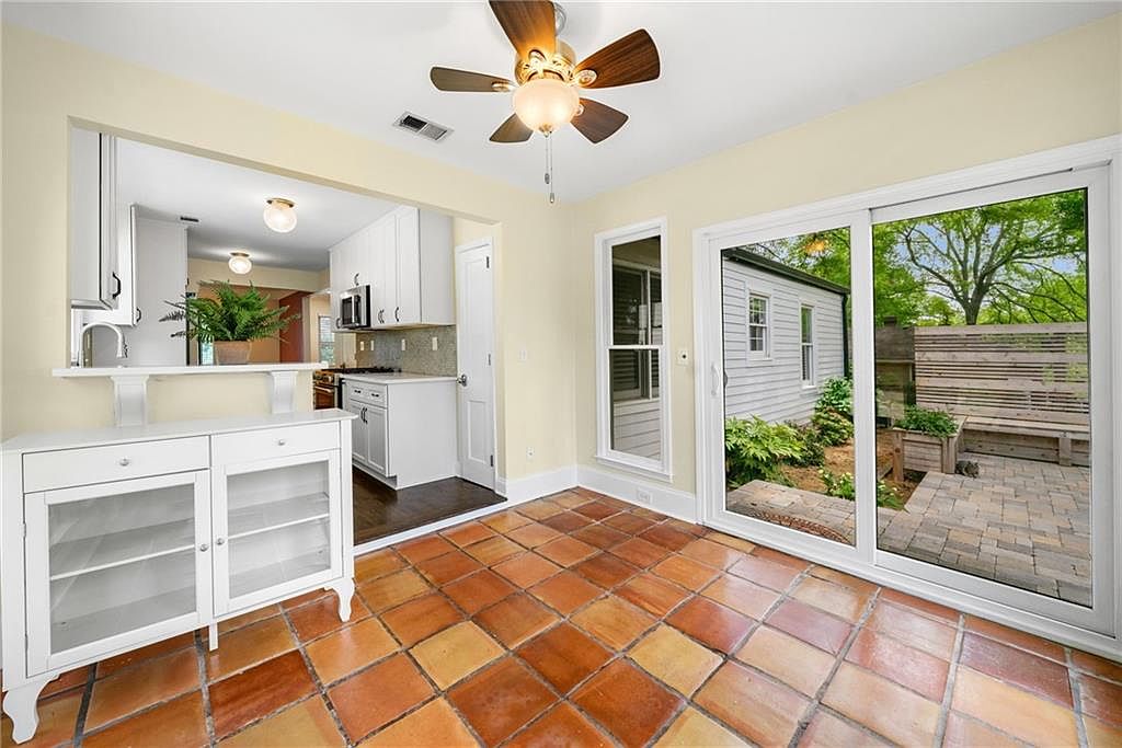 This charming breakfast nook features warm terracotta tile flooring that adds a rustic touch and contrasts beautifully with the soft cream walls. A white cabinet with glass doors offers discreet storage while maintaining an airy feel. Above, a wooden ceiling fan with a light fixture provides both comfort and style. The space opens to a bright kitchen visible through a half-wall and pass-through window, creating a seamless flow. Large sliding glass doors lead to a paved patio with greenery and a wooden bench, blending indoor and outdoor living harmoniously.