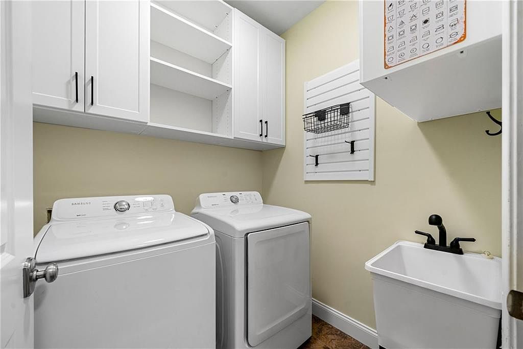 This laundry area showcases a clean, functional design with a neutral beige wall color that complements the bright white cabinetry and appliances. Two Samsung machines—a washer and dryer—sit side by side beneath wall-mounted white cabinets with black handles, providing ample storage and organization. One cabinet features open shelving for easy access, while a white utility sink with a matte black faucet is installed nearby, enhancing convenience. A white slatwall panel with black wire baskets and hooks offers added practicality for hanging and storing laundry essentials. The floor features darker, warm-toned tiles, grounding the space with contrast and durability.
