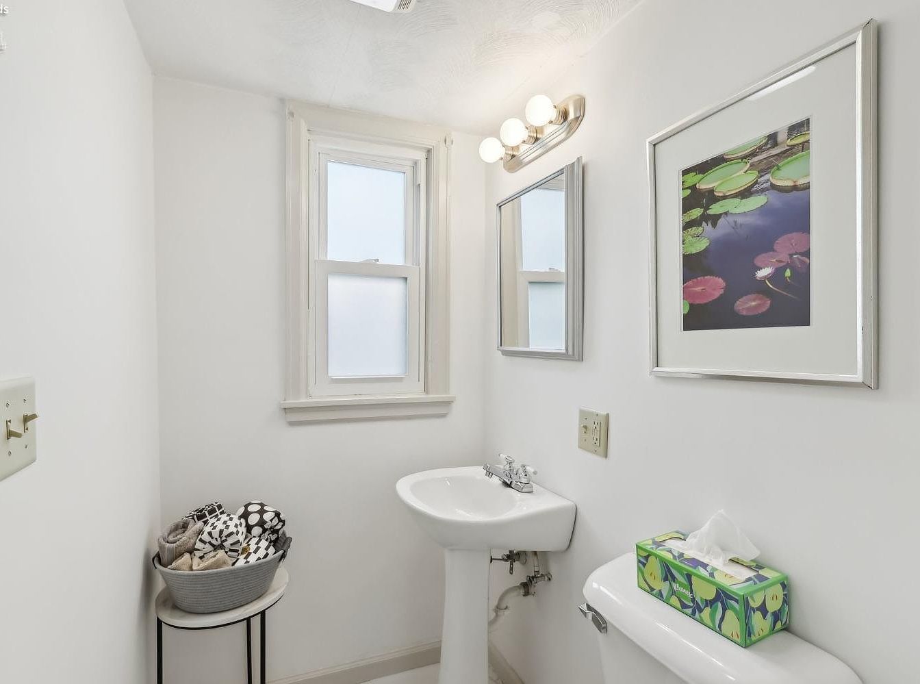 This compact powder room embraces a clean, minimalist design with bright white walls and fixtures that create a fresh, airy atmosphere. A small pedestal sink sits beneath a rectangular mirror, topped by a three-bulb vanity light fixture with round bulbs, adding a soft glow to the space. The room includes a single window framed in white trim, introducing natural light while maintaining privacy with frosted glass. A framed botanical print adds a splash of color and interest above the toilet, which also holds a decorative tissue box. A side table holds a basket filled with neatly rolled towels in neutral patterns, further enhancing the room’s simplicity and functionality.
