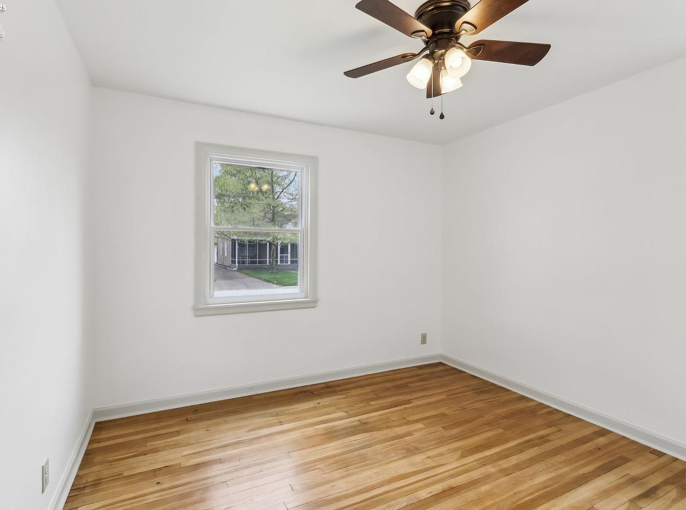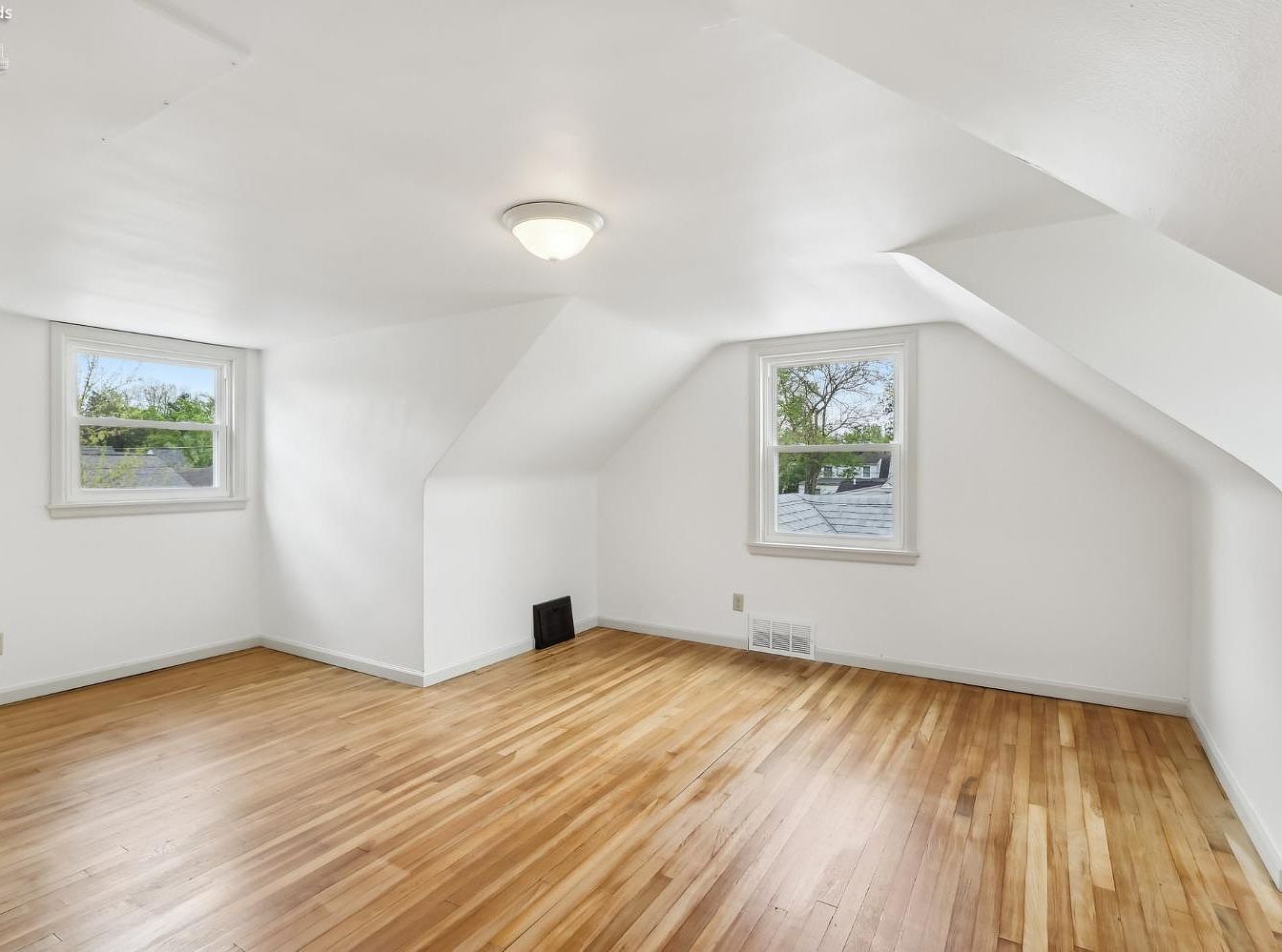 This upstairs bedroom offers a bright and airy atmosphere with its crisp white walls and ceiling, maximizing natural light from two well-placed windows. The space features charming sloped ceilings that add architectural character and cozy charm. Warm honey-toned hardwood floors contrast gently with the white, creating a clean, modern aesthetic. A simple flush ceiling light fixture provides ample overhead illumination. The room’s minimalistic design offers a blank canvas versatile for various furniture arrangements, perfect for a peaceful retreat or personalized study area while benefiting from views of the surrounding greenery outside.