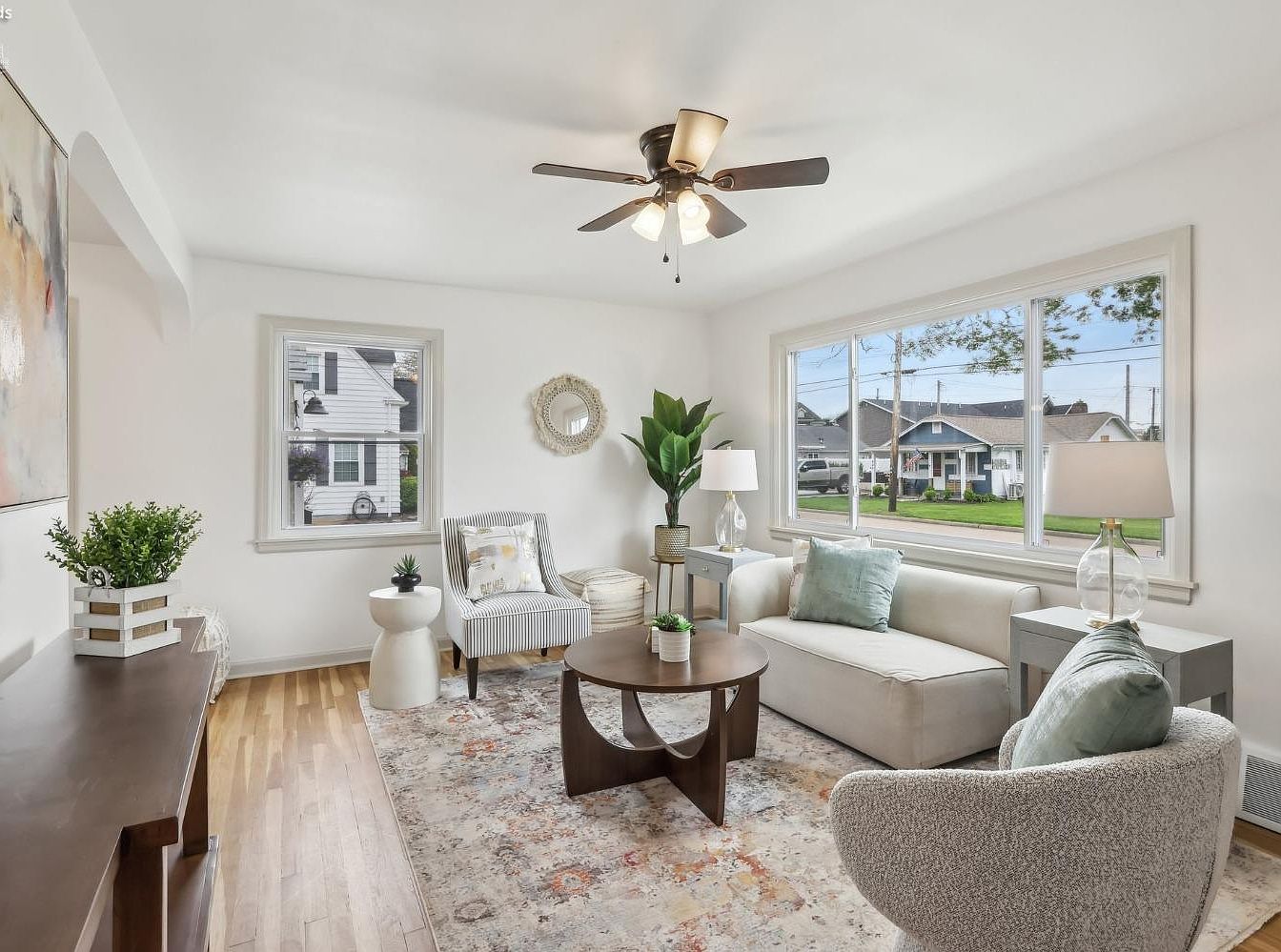 This bright living room features a soothing neutral palette with off-white walls and light wood flooring that enhances the airy ambiance. The space is arranged with a cream-colored sofa complemented by soft green pillows, a textured gray armchair, and a classic striped accent chair, creating a balanced seating area around a modern round wooden coffee table. Large windows flood the room with natural light and offer street views, while tasteful decor such as a patterned area rug, a potted plant, soft ambient table lamps, and a ceiling fan contribute to a cozy, inviting atmosphere with subtle contemporary charm.