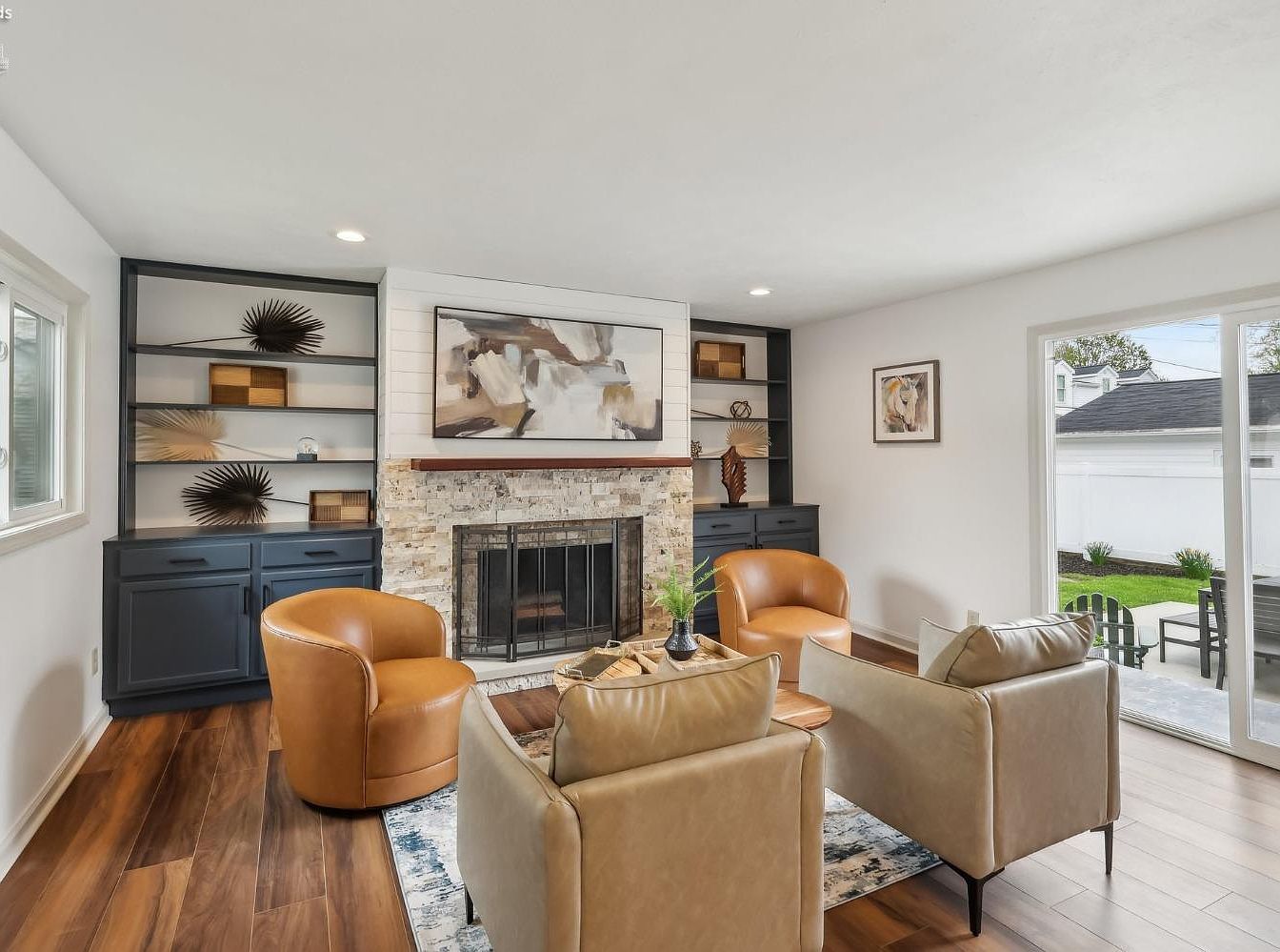 This living room centers around a textured stone fireplace flanked by symmetrical built-in shelving units painted in dark charcoal, which contrast elegantly with the bright white shiplap wall above the hearth. The space has a warm, inviting ambiance highlighted by rich walnut-toned hardwood floors and a neutral color palette of beige and caramel. Two tan leather swivel chairs and two matching armchairs create a cozy sitting area placed atop a muted blue and ivory area rug. Ample natural light floods the room through sliding glass doors, revealing a view of a neat backyard patio. Contemporary abstract artwork adds a touch of sophistication to the minimalist décor.