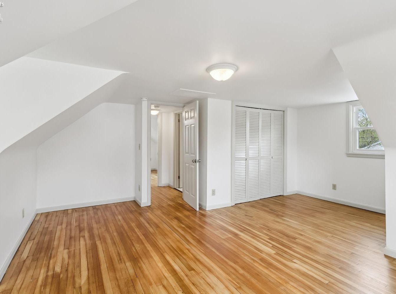 This upstairs bedroom features angled ceilings characteristic of an attic conversion, offering a cozy and unique architectural detail. The room is spacious with polished natural hardwood floors that add warmth against the fresh white walls and ceiling. A large window provides ample natural light and a view of greenery outside, enhancing the airy feel of the space. The room includes a closet with white louvered bifold doors, adding practicality and charm. The simple dome light fixture on the ceiling offers soft illumination, completing this clean, bright, and inviting retreat.
