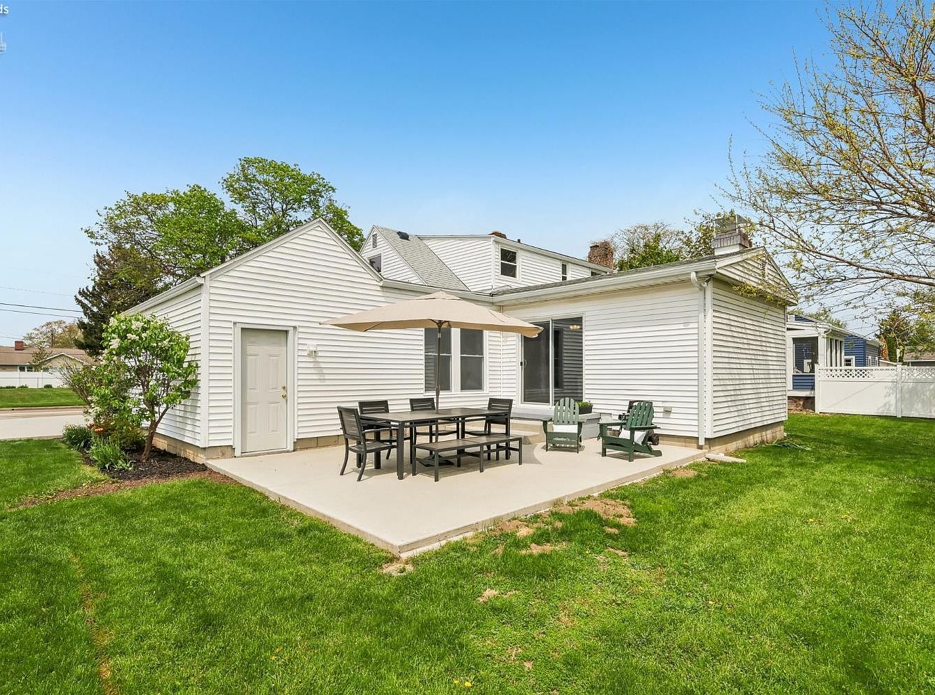This backyard patio features a clean, spacious concrete slab that comfortably hosts a black metal dining table with six matching chairs and a bench, shaded by a large beige patio umbrella. Adjacent to this dining set, two green Adirondack chairs face a small table, creating a cozy spot for relaxation. Surrounded by well-maintained, vibrant green grass, the space is framed by a white-sided house with multiple window panes and sliding glass doors, allowing easy access indoors. The overall aesthetic is simple, inviting, and functional, perfect for outdoor entertaining or quiet afternoons under clear blue skies.