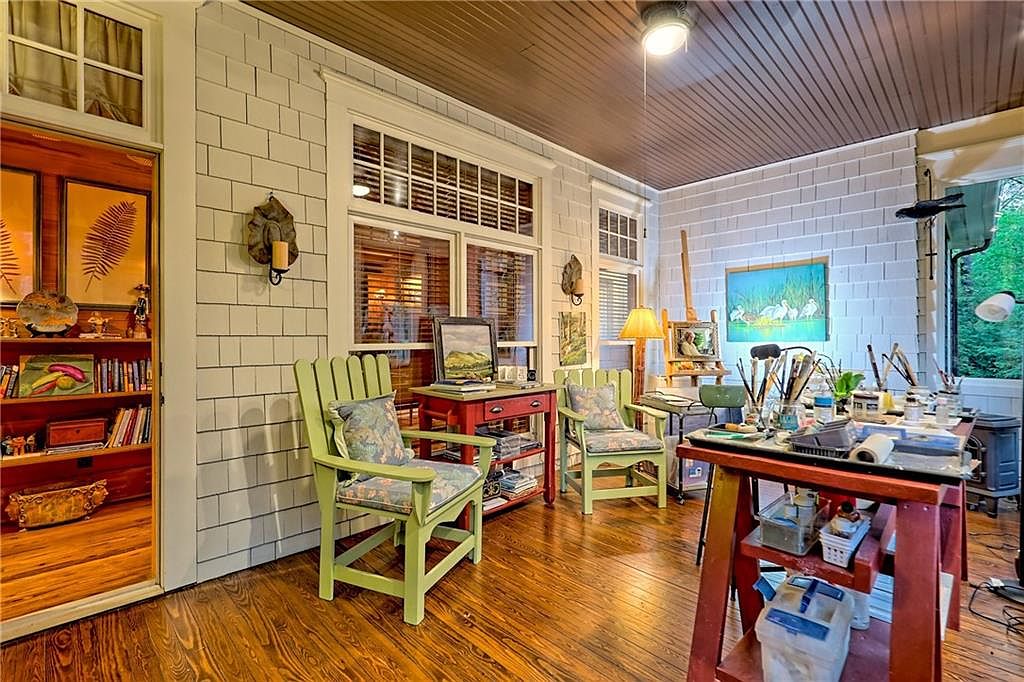 This inviting porch space serves as a bright and airy art studio, blending comfort with creativity. The walls are covered with light-colored shingles and cinder blocks, harmonizing with the warm wood floor and brown beadboard ceiling. Two soft green wooden armchairs with floral cushions sit against the wall, flanking a red wooden table that holds art supplies and books. Natural light filters in through large windows with white trim, accentuating the earthy tones and artistic ambiance. A well-used worktable displays various brushes, paints, and tools, while an easel with a colorful painting adds a personal, artistic touch to the space.