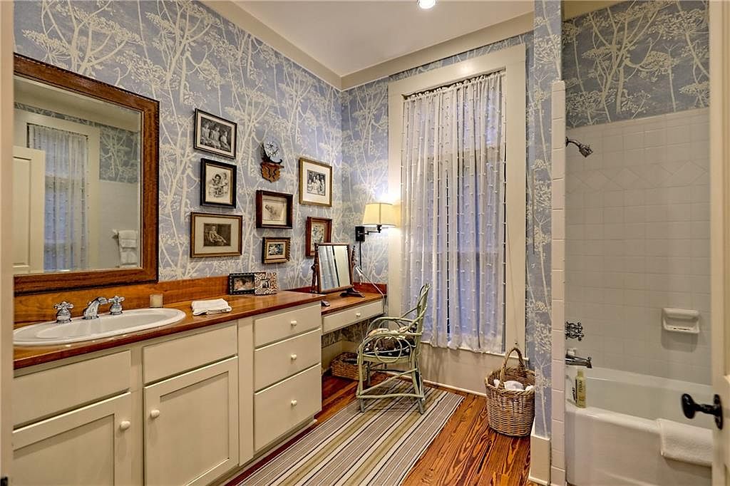 This bathroom features a charming vintage style with light blue wallpaper adorned with a delicate white tree motif, adding a serene, natural atmosphere. The long wooden countertop spans the length of the vanity, combining a classic wood surface with off-white cabinetry equipped with simple knobs. A large framed mirror above the sink enhances the space. On one side, an inviting vanity nook is complete with a wicker chair and a small mirror perfect for personal grooming. A soft striped rug lays across the warm wooden floor, contributing to the cozy and thoughtful aesthetic. The bathtub area has white tile walls and a curtain that complements the light, airy feel of the room. Multiple framed photographs and artwork hang on the wall, adding a personalized, homey touch.