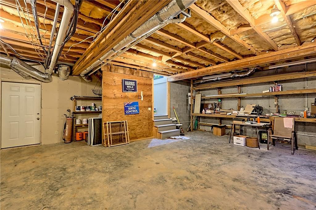 This basement area is a spacious, unfinished workspace with exposed wooden beams and insulation visible on the ceiling. The concrete floor extends throughout, contributing to an industrial and utilitarian aesthetic. Along the far wall, lengthy wooden shelves offer ample storage and organization for various tools and materials. A simple workbench and chair are positioned here, suggesting functionality over comfort. A wooden partition with signage separates the stairwell that leads upstairs, while a white door on the left likely provides access to an exterior entry or utility room. The overall aesthetic is raw and practical, suited for projects or storage.