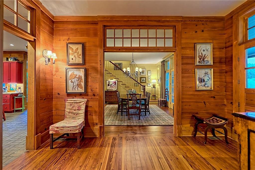 This warm and inviting space serves as a transitional entryway, opening directly into a classic dining room. Rich honey-toned wood paneling and flooring create a cozy, rustic atmosphere, complemented by artwork featuring natural motifs. The room’s layout highlights spaciousness, with a view into the dining area that features a traditional wooden dining table and chairs over a patterned area rug. A chandelier with multiple lights centers above the table. To one side, red-painted kitchen cabinetry is visible through an open doorway, adding a pop of color while maintaining an overall timeless, comfortable aesthetic with subtle farmhouse charm.