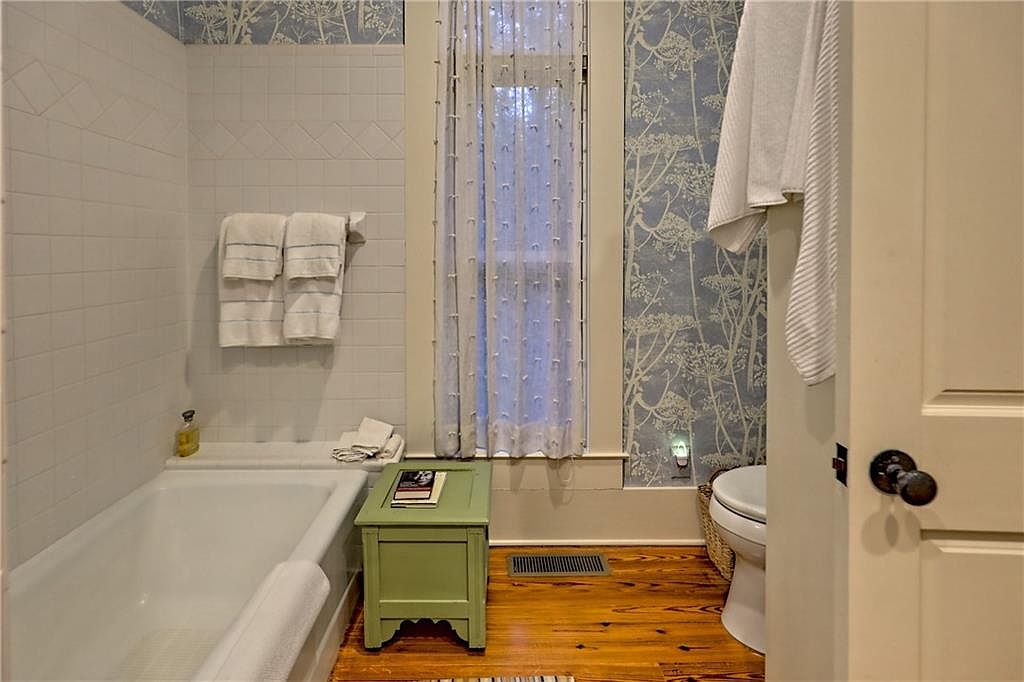 This quaint bathroom features a soft, serene color palette with light blue floral wallpaper adding a graceful touch to the walls. The white tiled bathtub is framed by cream-colored walls, complementing the vintage aesthetic. Natural wood floors ground the room with warmth and rustic charm. A small green wooden side table between the tub and toilet offers both functionality and a pop of muted color, topped with books and neatly folded towels. Sheer white curtains allow diffused natural light, enhancing the tranquil ambiance. Classic touches such as the dark bronze door knob and woven basket add subtle sophistication.