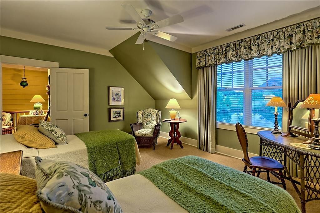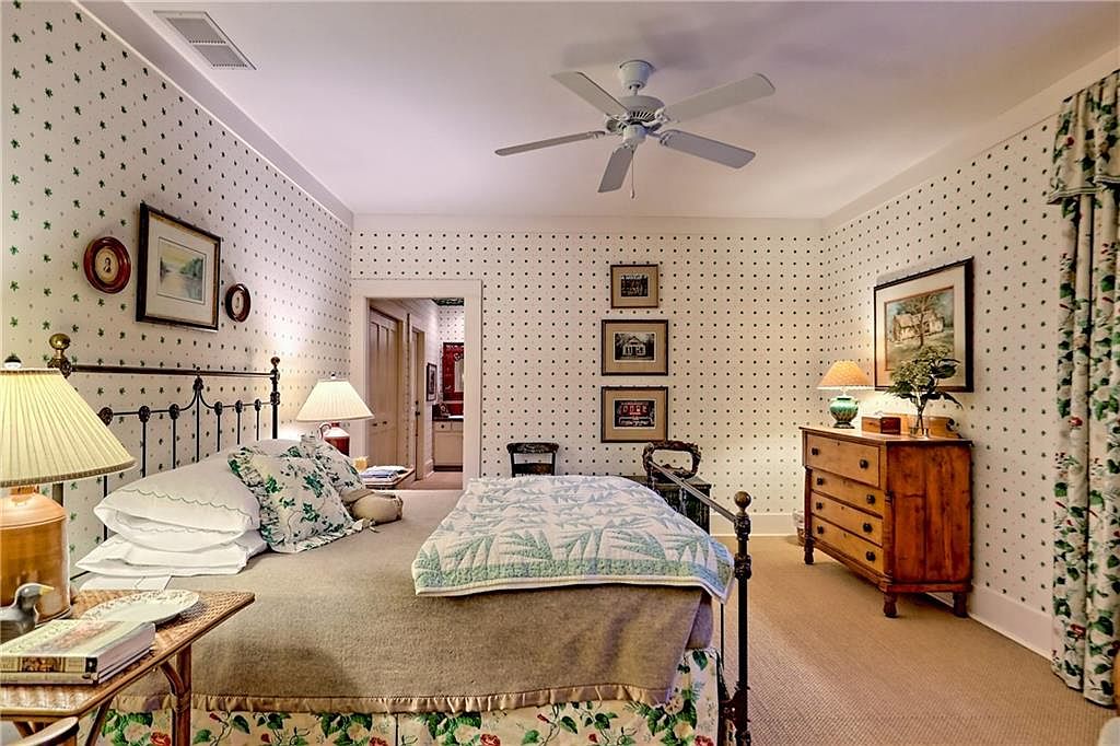 This serene bedroom features a classic iron bed frame adorned with a quilted bedspread and florally patterned pillows, complementing the vintage wallpaper that lightly dots the walls with subtle green motifs. The room’s warm and inviting atmosphere is enhanced by natural wood furniture, including a sturdy chest of drawers and a bedside table topped with traditional lamps casting a soft glow. An ornate chair and framed artworks add character and depth. Soft beige carpeting underfoot completes the cozy feel, while a ceiling fan contributes to comfort. The adjoining bathroom is visible through a doorway, emphasizing the thoughtful layout and flow of the space.