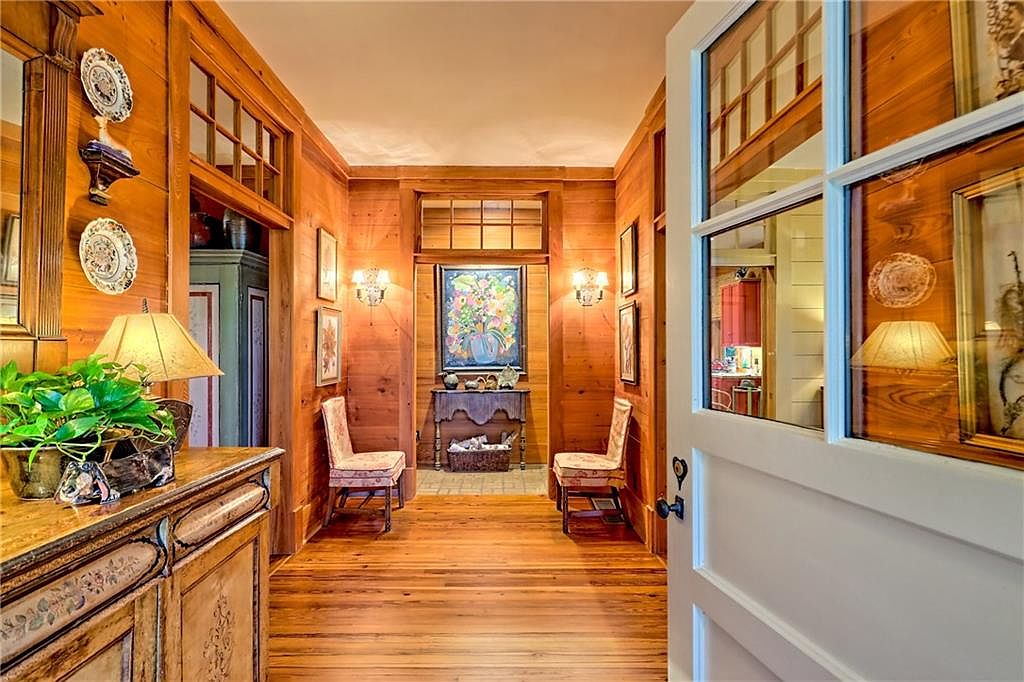 This inviting entry hallway features rich wood paneling on the walls and warm-toned hardwood flooring that exudes a rustic charm. The left side hosts a vintage-inspired console table adorned with a glowing lamp and lush greenery, creating a welcoming atmosphere. Opposite, two upholstered chairs with floral patterns sit beneath delicate sconces that provide soft illumination. At the far end, a small wooden side table beneath a bright, colorful floral painting anchors the space. Above the doorway and openings, transom windows add architectural interest and allow natural light to flow through, enhancing the cozy, warm ambiance.