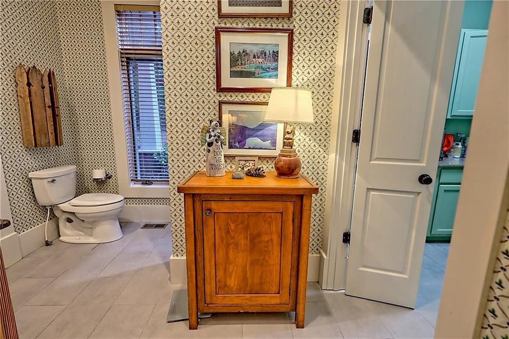 This bathroom section offers a balanced mix of functionality and warm decor. The white toilet sits adjacent to a narrow window with wooden blinds that introduce natural light while maintaining privacy. The walls are covered with a patterned wallpaper featuring a subtle geometric leaf design in muted tones, adding vintage charm. Dominating the space is a small, rich wood cabinet topped with a lamp that gives off a cozy glow, alongside decorative pieces and framed landscape artwork, creating an inviting and personal atmosphere. The light tile floor ties the space together with a clean, modern finish. Through the doorway, a glimpse of a mint-green kitchen adds a pop of color contrast.