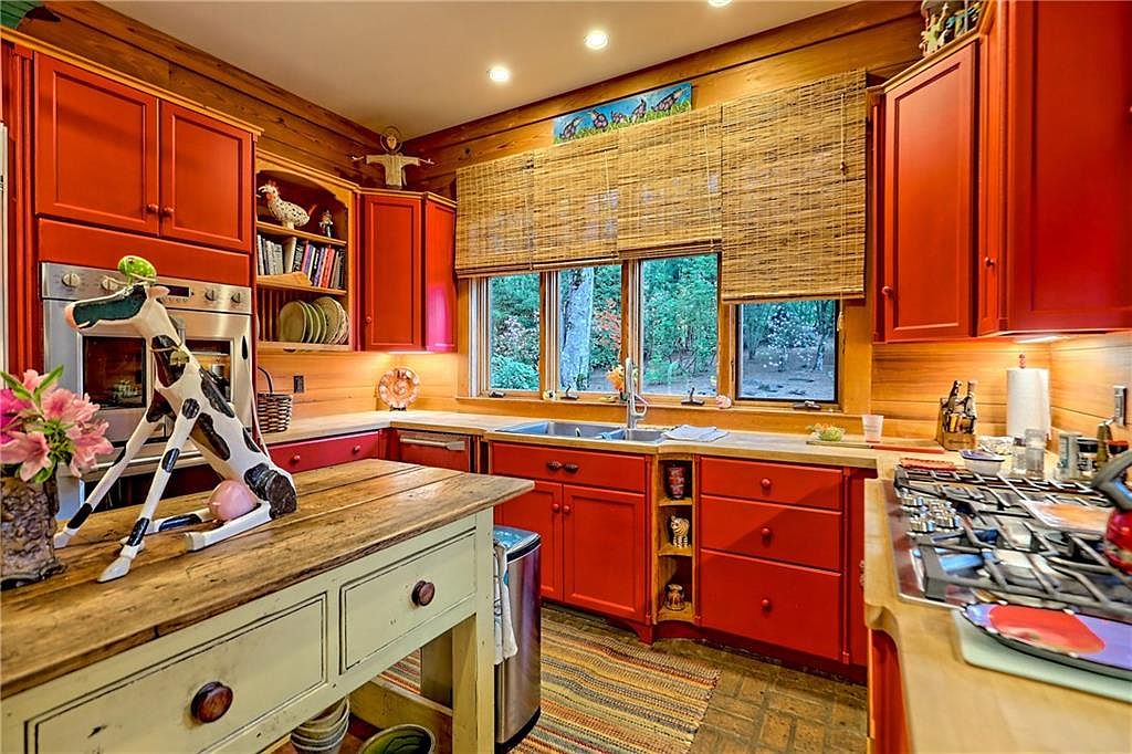 This charming kitchen blends rustic warmth with vibrant color. The cabinetry, painted a bold red, adds a lively contrast against natural wood walls and ceilings, creating an inviting and cozy atmosphere. A wide window over the sink provides a peaceful forest view, softened by woven bamboo blinds that contribute earthy texture. The central island features distressed cream cabinetry topped with a natural wood countertop, adding farmhouse character. Open shelving holds curated ceramics and cookbooks, while stainless steel appliances and a gas stove offer modern functionality. A striped rug and playful cow figurine add charm and personality to the space.