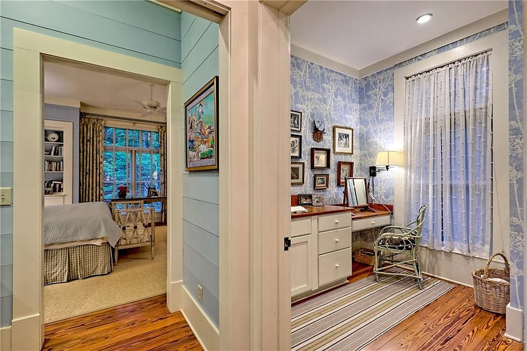 This cozy bedroom features classic architecture with warm wooden floors that flow into a charming dressing nook. The bedroom walls are painted a muted blue and neutral tones dominate the bedding and drapery, creating a calming retreat. The adjacent dressing nook is beautifully adorned with delicate blue wallpaper featuring a nature-inspired pattern, adding subtle texture and visual interest. White cabinetry with ample drawers and a wood countertop provide practical storage and workspace. A wicker chair and soft, sheer curtains bedeck the window, and a gallery wall of framed pictures adds character to the intimate dressing area.