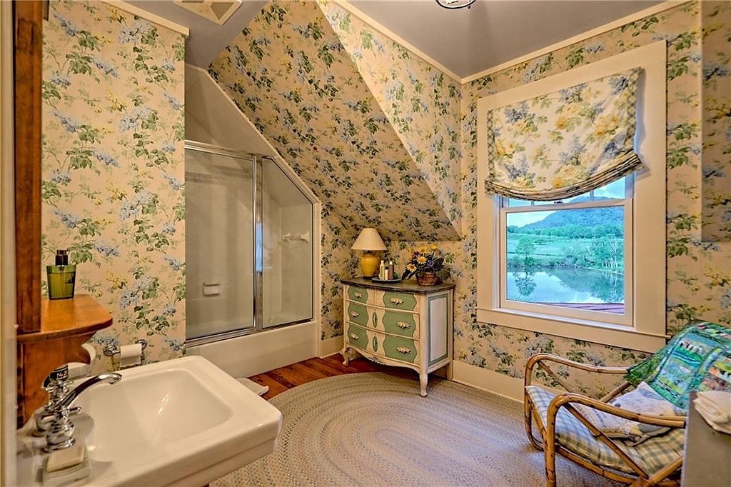 This bathroom combines vintage charm and cozy functionality under a sloped ceiling that adds character. A floral wallpaper in soft pastel colors of green, blue, and yellow envelopes the walls, creating a nostalgic and inviting atmosphere. The white porcelain sink features classic chrome fixtures, and above it hangs a wooden-framed mirror. Adjacent to the bathtub with glass sliding doors is a quaint dresser painted in muted green and cream, topped with a yellow lamp and decorative items. The window with a matching floral roman shade lets in natural light and offers serene views of a lush landscape and river, enhancing the tranquil ambiance. A rattan armchair with blue-check upholstery adds a homey touch, making this bathroom a restful retreat.