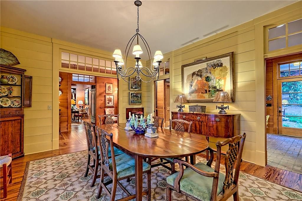 This dining area is defined by warm, honey-toned yellow walls with horizontal paneling, complementing the polished hardwood floors. A large traditional wooden dining table anchors the room, surrounded by intricately carved chairs upholstered in a muted sage green fabric. The overhead chandelier features a wrought iron frame with soft cream lampshades, providing a gentle, inviting light. Decorative elements include a richly stained wooden sideboard topped with matching lamps and a sizeable floral-themed painting. Adjacent doorways with transom windows and glass-paned doors open into other rooms, creating a sense of flow and openness in this charming, classic space.