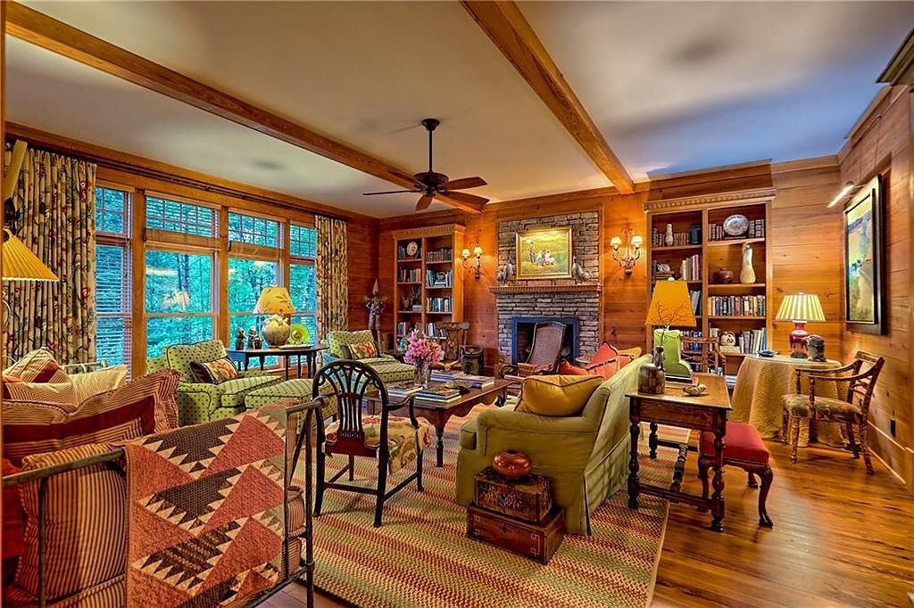 This inviting living room combines rustic charm with classic comfort, featuring rich wood-paneled walls and exposed ceiling beams that create a warm, cabin-like ambiance. A large stone fireplace serves as the room’s focal point, flanked by built-in bookcases filled with books and decorative objects. The seating arrangement includes patterned upholstered armchairs and a muted sage green sofa, accented with throw pillows in earthy tones. Large windows with wooden frames and patterned curtains provide ample natural light and views of greenery outside, while table lamps and wall sconces enhance the soft, layered lighting. The braided rug adds texture and ties together the varied furniture styles.