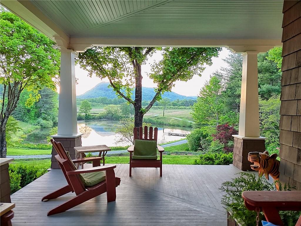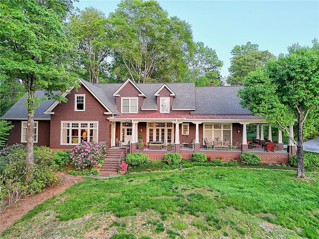 This charming country estate in Tiger, Georgia, exemplifies a refined traditional architectural style with its warm earth-toned siding, gabled rooflines, and expansive wrap-around porch supported by classic columns. Nestled amidst lush greenery and mature trees, the home offers a peaceful and scenic setting just five minutes from downtown Clayton. The listed price for this exclusive property is $2,250,000. This estate combines timeless design with a tranquil rural environment.