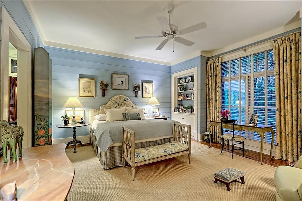 This tranquil master bedroom exudes a charming vintage elegance, anchored by soft blue shiplap walls and creamy white accents. The bed features an upholstered floral headboard, complemented by matching fabric on a small bench at the foot. Flanking the bed are two classic side tables with traditional lamps casting warm light. A small wooden desk with a black chair sits beside expansive windows dressed in yellow floral drapes, allowing natural light to flood the room. Built-in shelving provides both display and storage, while the beige carpet and ceiling fan add to the comfort and inviting atmosphere.