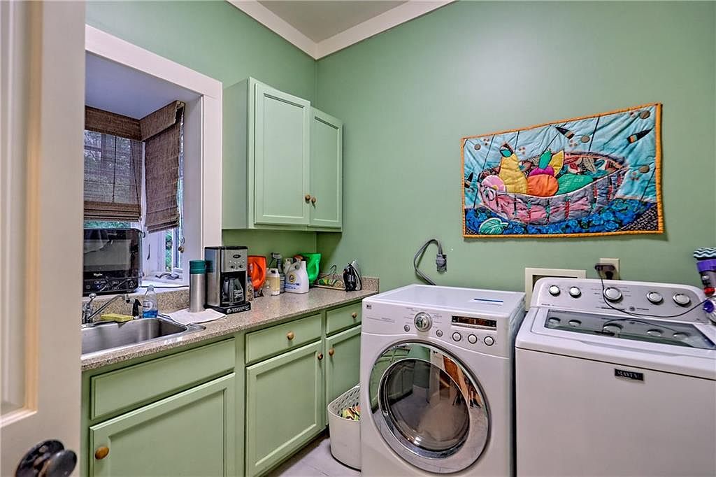 This cozy laundry room features a functional layout with side-by-side washer and dryer units in white, positioned beneath a wall adorned with a colorful, whimsical textile art piece. The cabinetry, painted in a muted sage green, complements the matching walls, creating a calming and cohesive aesthetic. A granite countertop spans across one side, offering ample workspace with small appliances and cleaning supplies neatly arranged. Natural light filters through a window outfitted with woven bamboo shades, enhancing the room’s bright and inviting atmosphere. Classic brass knobs on cabinets and a neutral floor tie the design together with understated warmth.