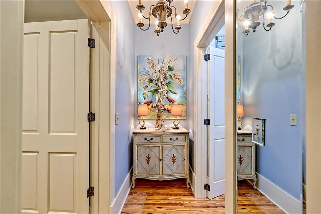 This charming hallway nook features soft blue walls contrasted with creamy white trim and doors, creating a calm and inviting atmosphere. A vintage-inspired distressed cabinet with subtle decorative accents stands centrally, topped by two small lamps that emit warm, ambient lighting. Above the cabinet, a large floral painting adds a splash of color and nature-inspired elegance. The rich, honey-toned hardwood floor complements the light color palette, while a classic chandelier overhead adds a touch of sophistication. The space is cozy and thoughtfully designed, perfect for adding a decorative focal point within a transitional area of the home.