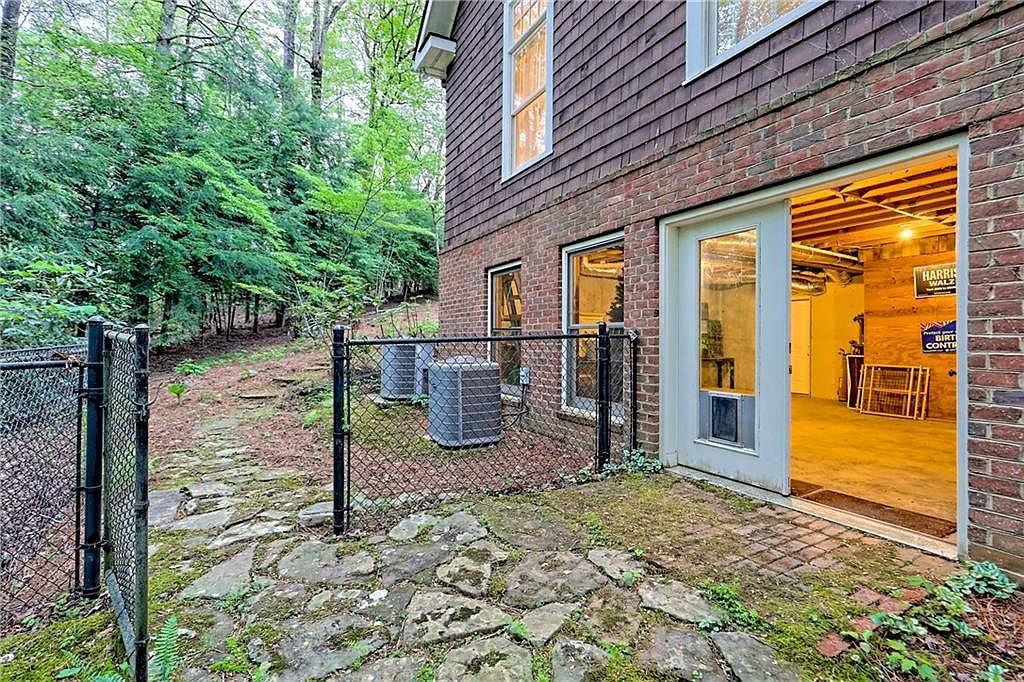 This basement entrance opens to a natural stone patio surrounded by rustic charm. The exterior walls combine traditional red brick with shingle siding, adding texture and warmth. A black chain-link fence provides a secure boundary for the outdoor area, while two air conditioning units sit beside the home. The open basement door reveals exposed wooden beams and concrete flooring, emphasizing a functional, unfinished space. Large windows flood the basement interior with light, contrasting the earthy tones outside with a slightly industrial indoor vibe. Lush greenery frames the pathway, suggesting a peaceful, wooded setting.