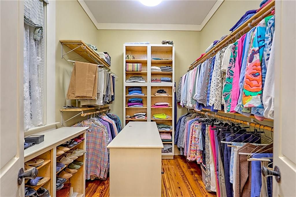 This walk-in closet features a well-organized layout with shelves, hanging rods, and cubbies on either side, creating ample space for clothing and accessories. The room is painted in a soft, neutral beige color that complements the rich, natural wood flooring with distinctive grain patterns. On the left, open shelving stores shoes and folded items, while the right side displays a colorful array of hanging clothes arranged by type and color. A central island provides additional surface area and storage, enhancing functionality. Light filters in through a window with lace curtains, adding a delicate, airy touch to the space.